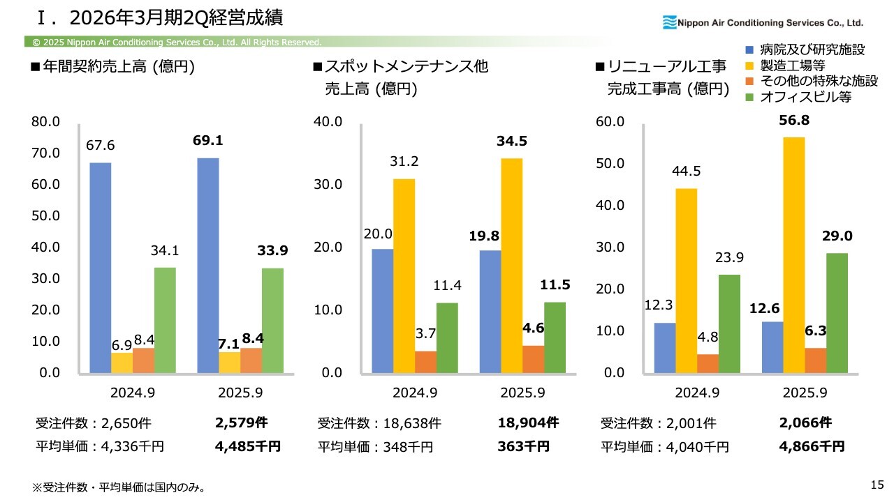 中央のグラフはスポットメンテナンス他の売上高を示しており、特に製造工場等での伸びが順調と見ています。