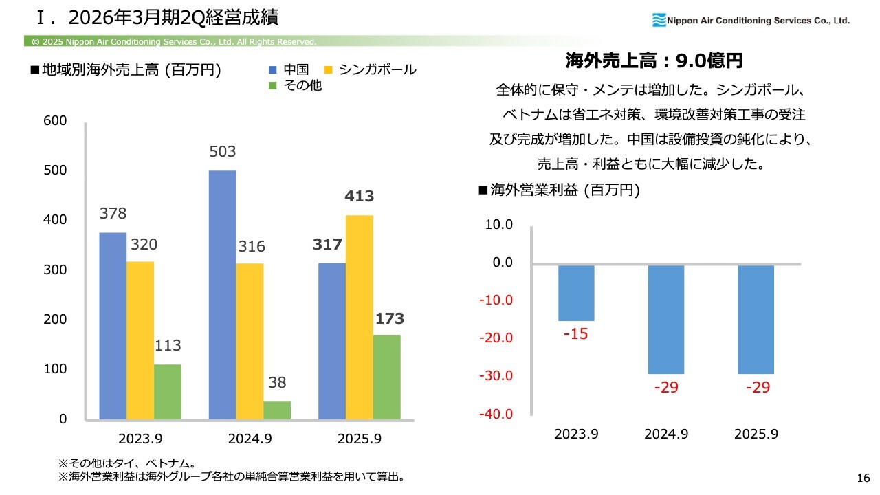 海外売上高の2026年3月期第2四半期実績は9億円です。ただし、営業利益が赤字となっているため、今後は利益の黒字化に向けて注力する必要があると考えています。