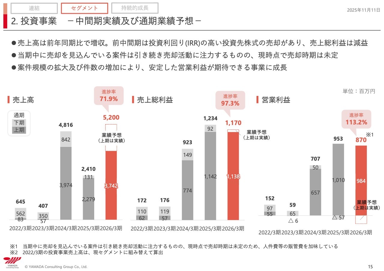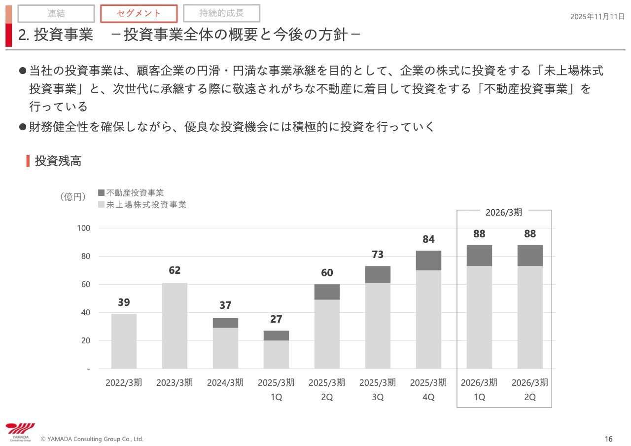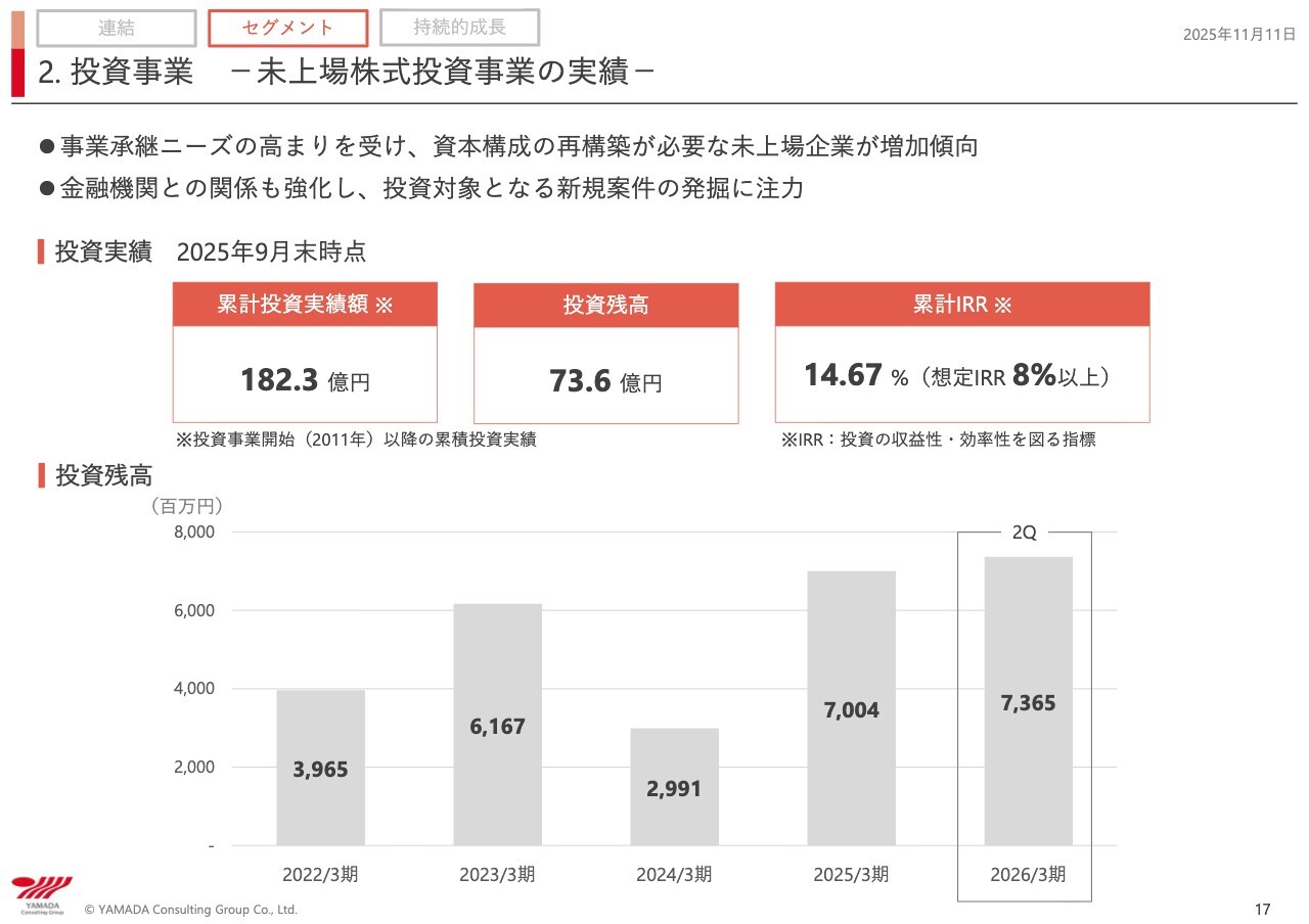 投資事業はコンサルティング事業の下支え要因であり、コンサルティング事業があってこそ投資事業もあると考えています。そのため、投資残高をしっかりと維持しながら一定レベルの収益を確保するべく、今後も10億円強規模の業績で推移できればと考えています。
