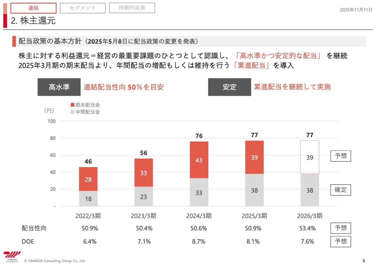 そのため、2025年3月期の期末配当から年間配当の増配もしくは維持を行う累進配当を導入しました。配当性向は約50パーセントを維持しており、今期の中間配当は38円、期末配当は39円を予定しています。