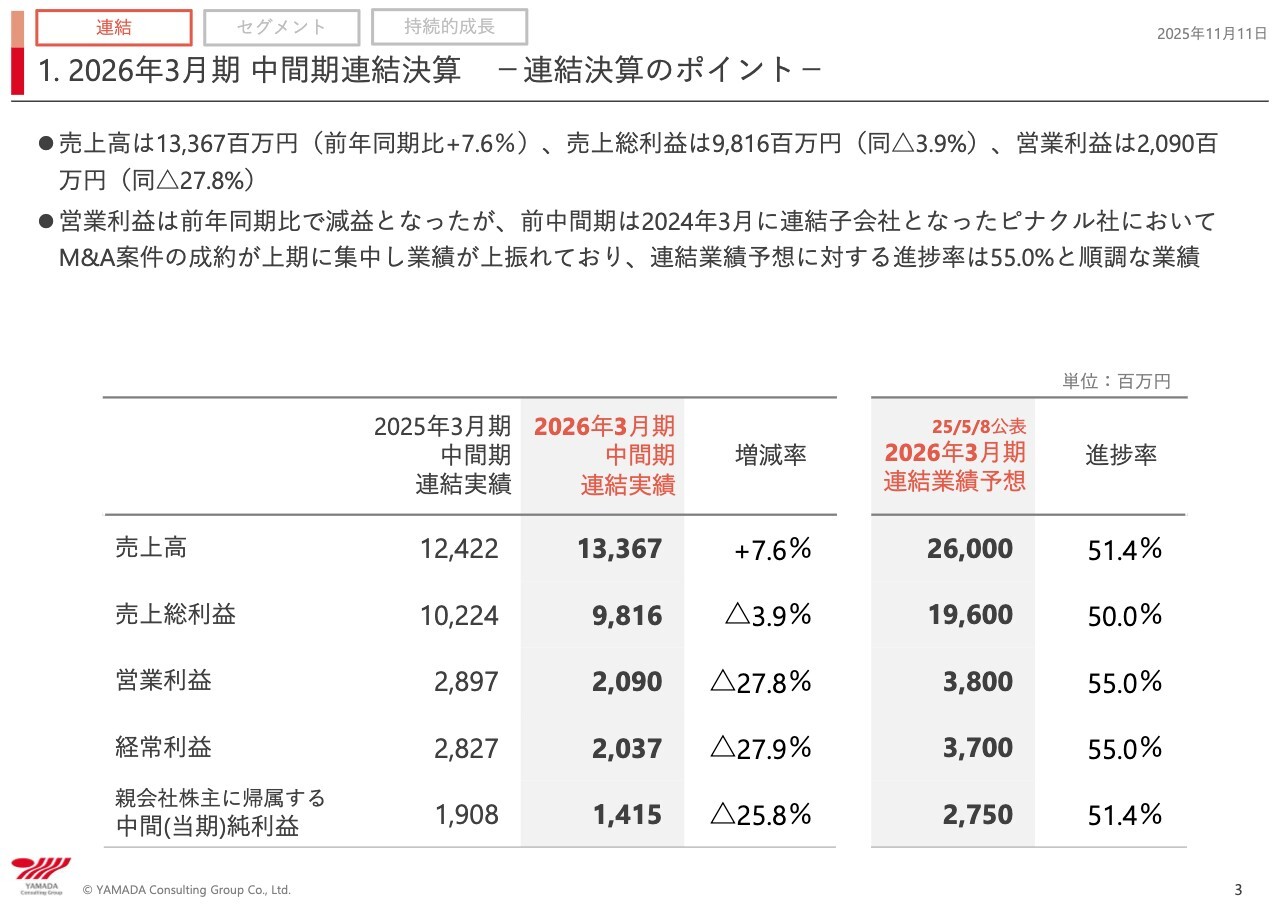 増田慶作氏(以下、増田):こんにちは。山田コンサルティンググループ、代表取締役社長の増田です。それでは、2026年3月期の中間期の決算についてご説明します。本日は、3つのテーマについてお話しします。