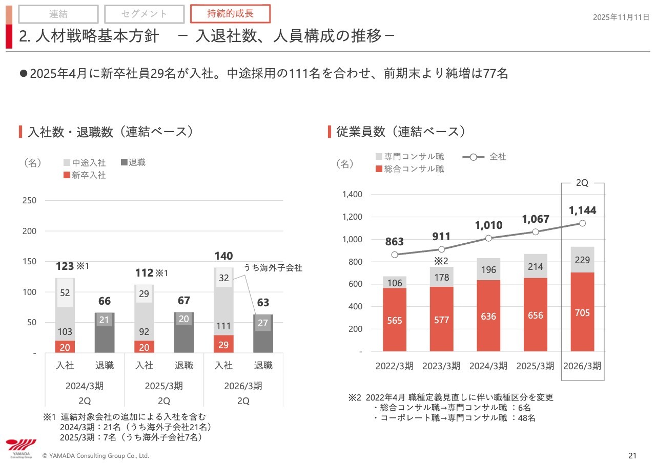 国内で見ると、入社が111名、退職が36名となっており、国内の退職者数は比較的低い水準で抑えられていると考えています。