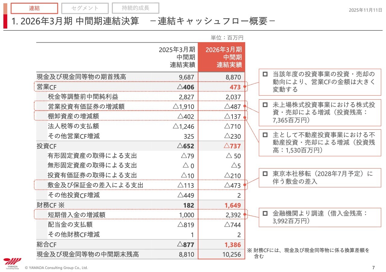 まず、営業キャッシュフローは4億7,300万円のプラスです。ただし、詳しく内訳を見ると、税金等調整前中間純利益が20億3,700万円、営業投資有価証券の増減額は未上場株式の投資が4億8,700万円増加し、投資残高は73億6,500万円と順調に投資が進んでいます。棚卸資産については、不動産投資事業で1億3,700万円の投資が行われた結果、投資残高は15億3,000万円となっています。