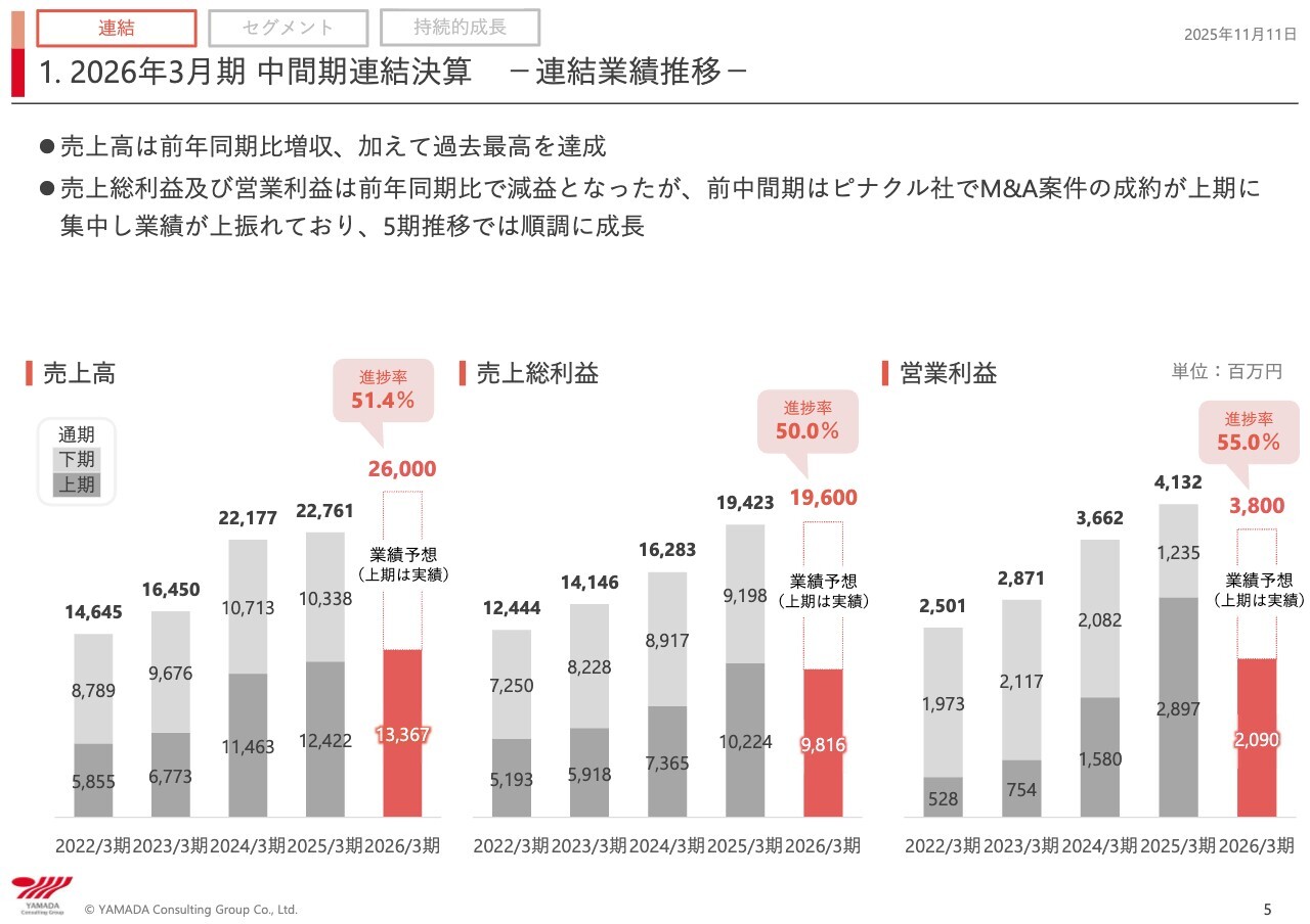 【QAあり】山田コンサルティンググループ、上期売上高は過去最高を達成、連結業績予想に対し順調に推移 人材採用拡大で組織力を強化