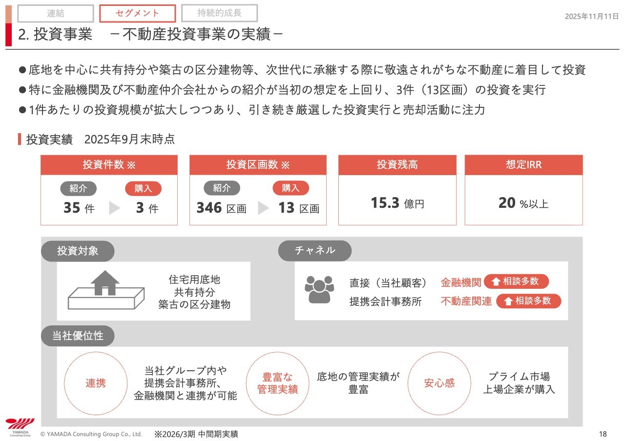 不動産投資事業については、残高が15億3,000万円となっています。さらに倍増できる規模に達する可能性があると考えています。この点に関しては、ご紹介いただく案件の規模は以前は数千万円単位が多かったものの、現在は数億円単位、場合によっては10数億円単位の案件が出てきています。当然ながら、不動産投資事業では未上場株式投資以上にリスクが伴いますので、リスクをしっかりコントロールしながら、投資を進めていきます。