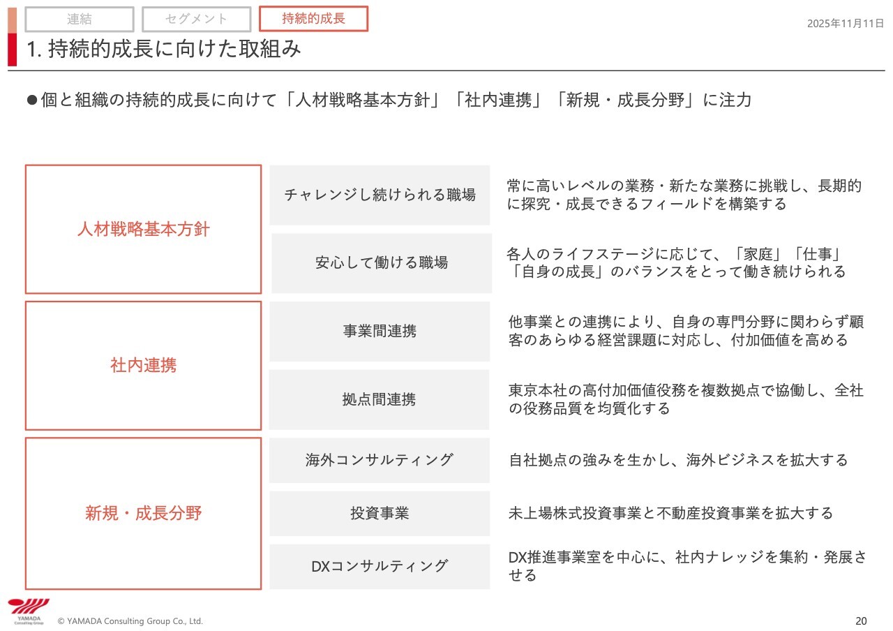 持続的成長に向けた取り組みについてです。当社は個と組織の成長を1つの大きなテーマとし、3つの取り組みを掲げています。つまり、メンバーの成長が組織の成長につながるものであり、このサイクルを堅持し、個の成長を促進していく。人を中心に据え、組織運営することを経営課題として進めています。
