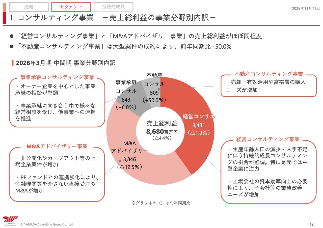 コンサルティング事業の事業分野別の内訳です。経営コンサルティング事業が34億8,100万円、M&Aアドバイザリーが38億4,600万円、事業承継コンサルティング事業が8億4,300万円、不動産コンサルティング事業が5億900万円となっていますが、これらの分野はお互いに絡み合いながら数字を構成しています。