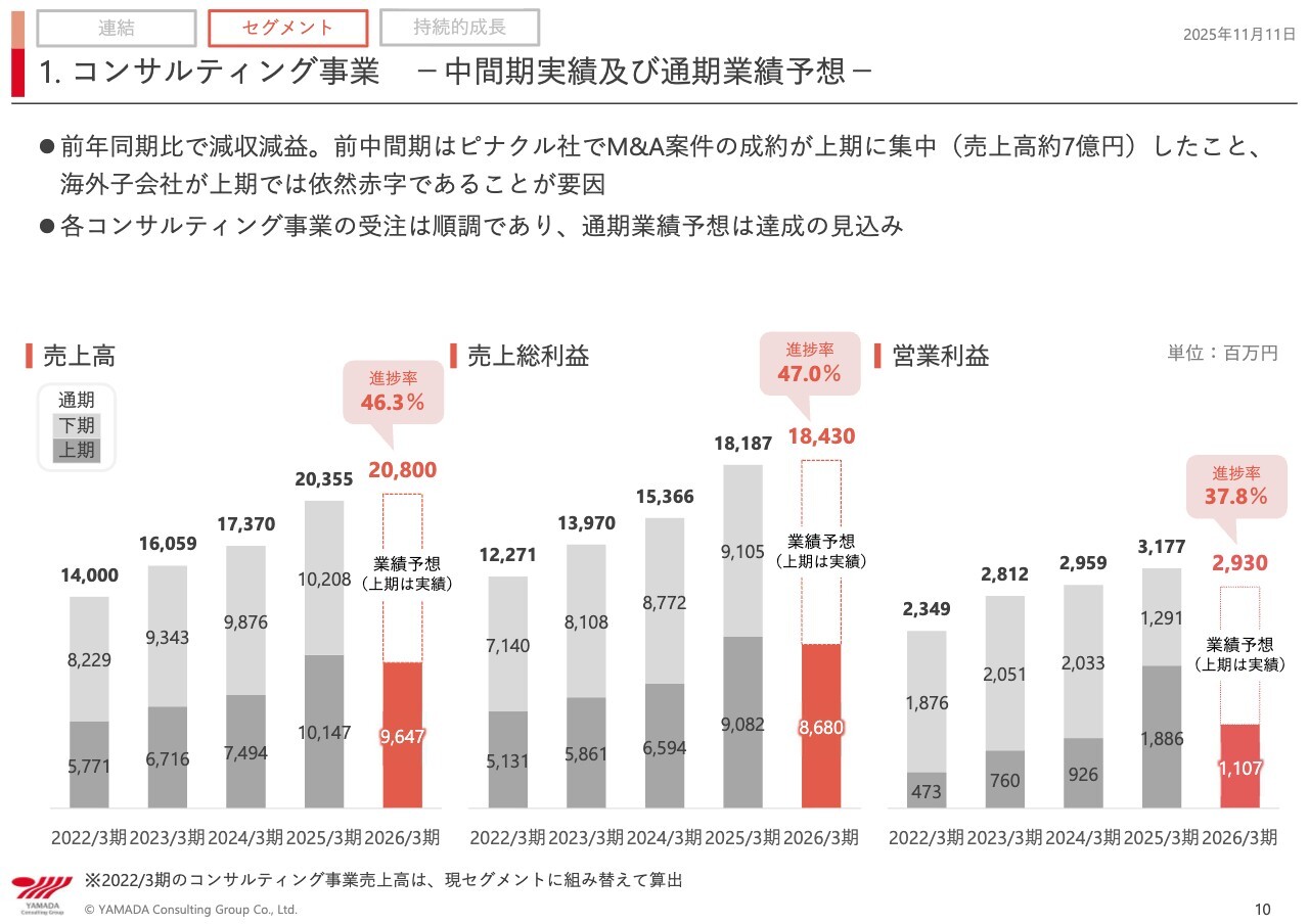 ピナクル社のM&A案件の成約が上期に集中しており、その売上が7億円でしたが、今期は上期の売上がほとんど計上されなかったことが、売上や営業利益の減少に直接影響している状況です。