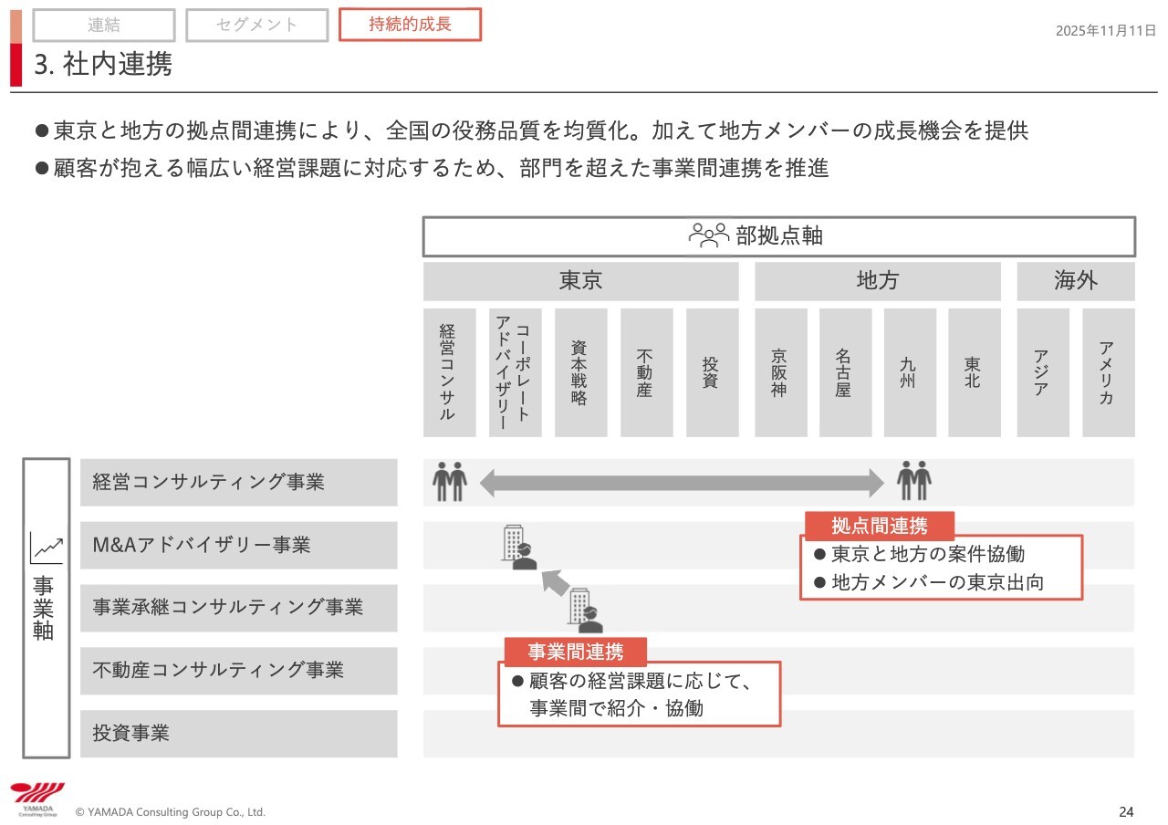 事業軸と部拠点軸についてです。特に部拠点軸では、東京のメンバーが非常に献身的に地方拠点との連携を行ってくれていると感謝しています。
