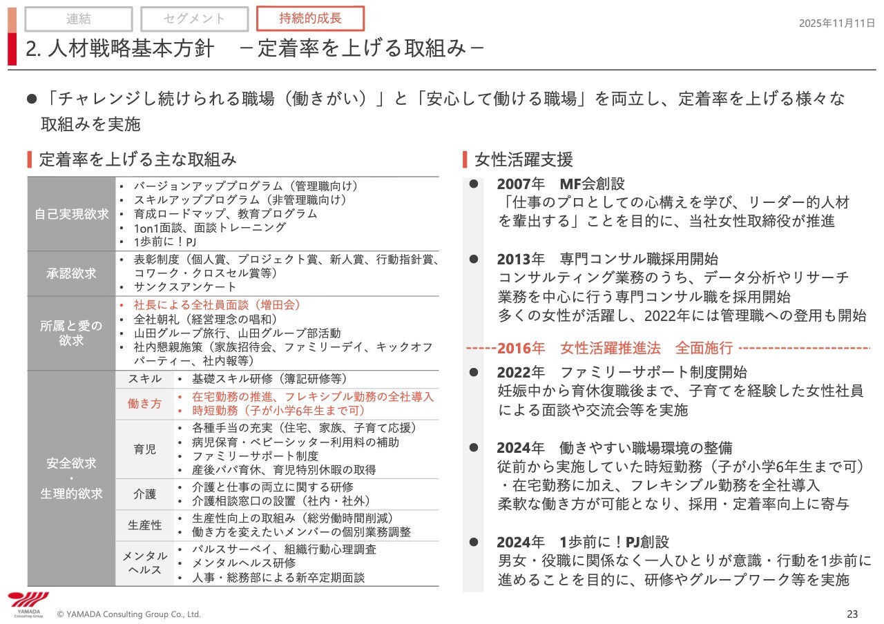 この3つの施策は、我々のようなコンサルティング会社にとっては比較的導入しやすいもので、これにより先ほど述べた退職者数の減少にもつながっていると考えています。我々自身、メンバーが持続的に成長すればパフォーマンスが向上し、その結果としてしか我々の成長は実現しないと考えています。