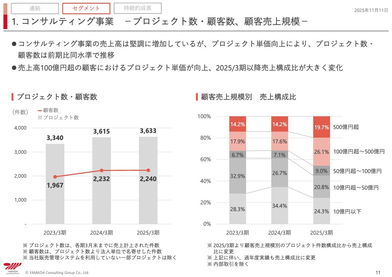 スライドはプロジェクト数・顧客数・顧客売上規模別のデータです。まず、プロジェクト数及び顧客数は、2024年から2025年にかけてほぼ横ばいとなっています。ただし、売上はなんとか増加させています。その理由は、プロジェクト単価を向上させたことによります。