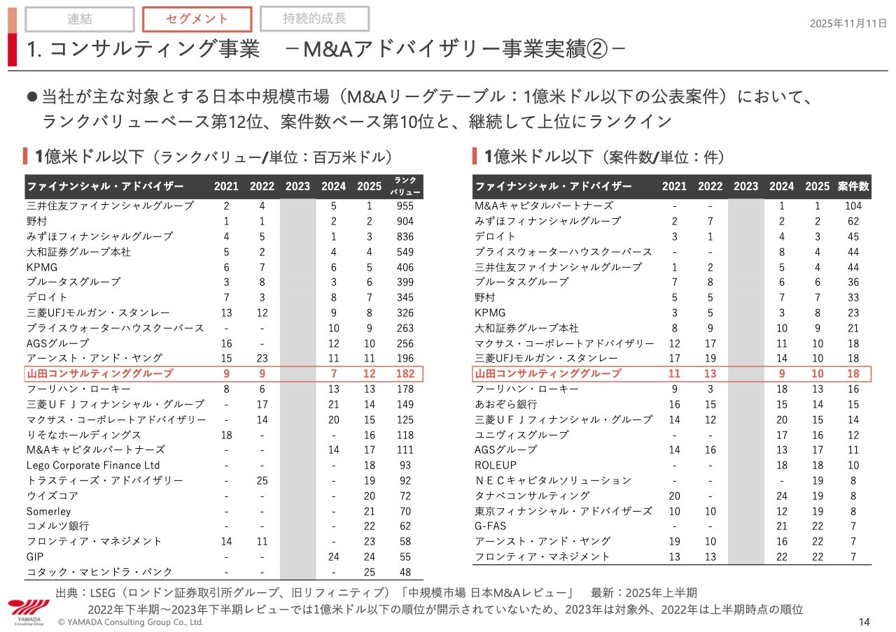 また、スライドに記載したように、M&Aアドバイザリー事業はPEファンドと連携強化しています。これにより、PEファンドからのお客さまに対して、M&Aの前後で経営コンサルティング事業のメンバーから始まり、PMI、すなわち事業価値向上のお手伝いをすることで、お客さまと線の関係性でつながることがあります。