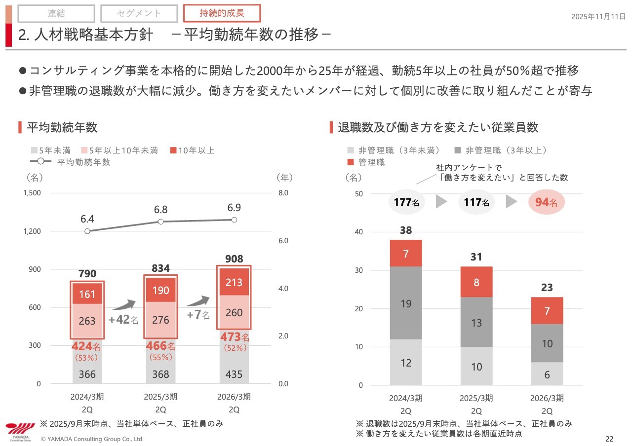 現状では、在職5年以上のメンバーが473名おり、特に10年以上のメンバーは213名で、前期比23名増えています。長期勤務者の存在がコンサルティング会社としての当社の大きな特徴であると自負しています。
