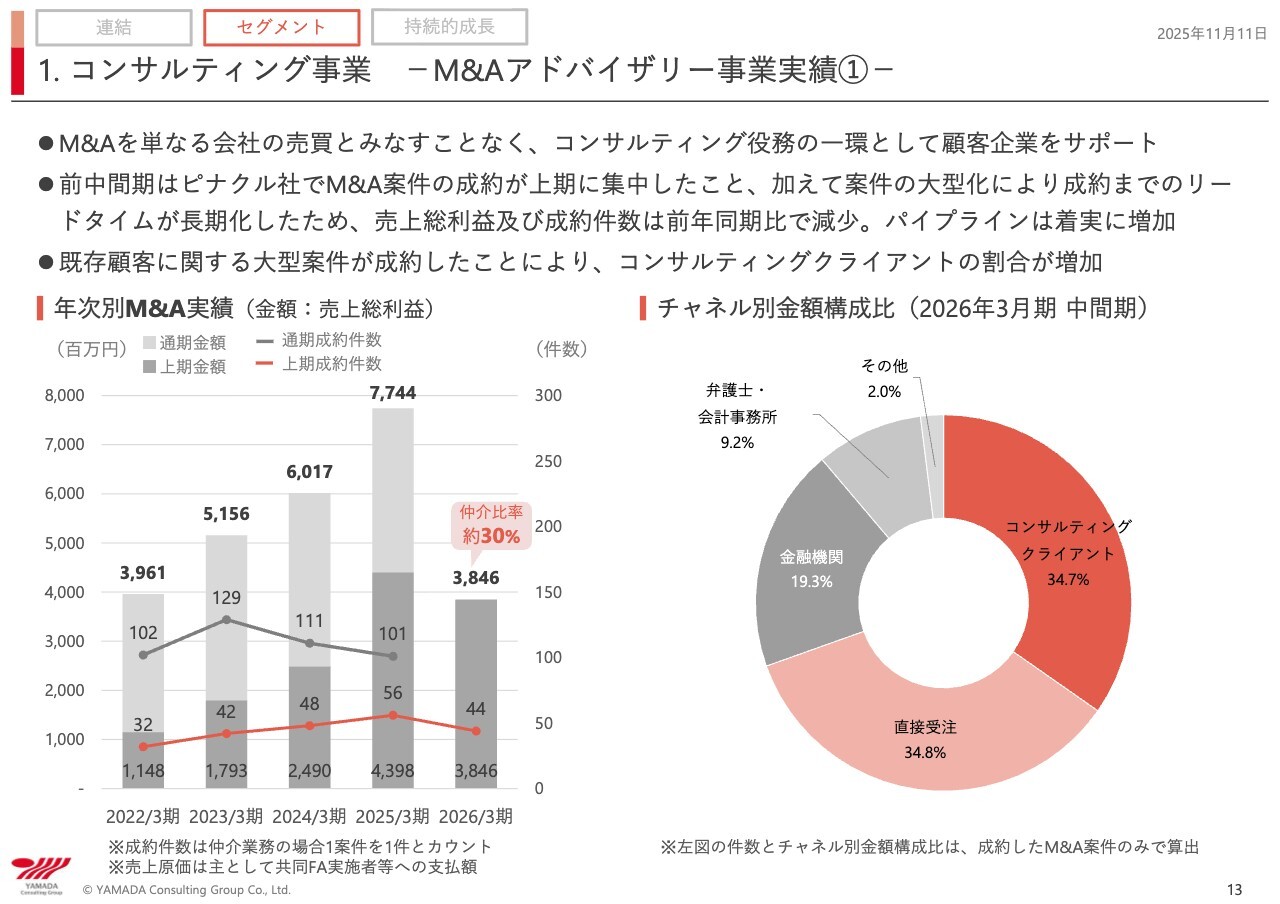 M&Aアドバイザリー事業の中間期実績です。まず、左側の年次別M&A実績について、売上高は43億9,800万円から38億4,600万円へと約5億5,000万円減少しました。先ほどお伝えしたピナクル社の影響もその一因と考えています。また、件数も56件から44件へと12件減少しました。