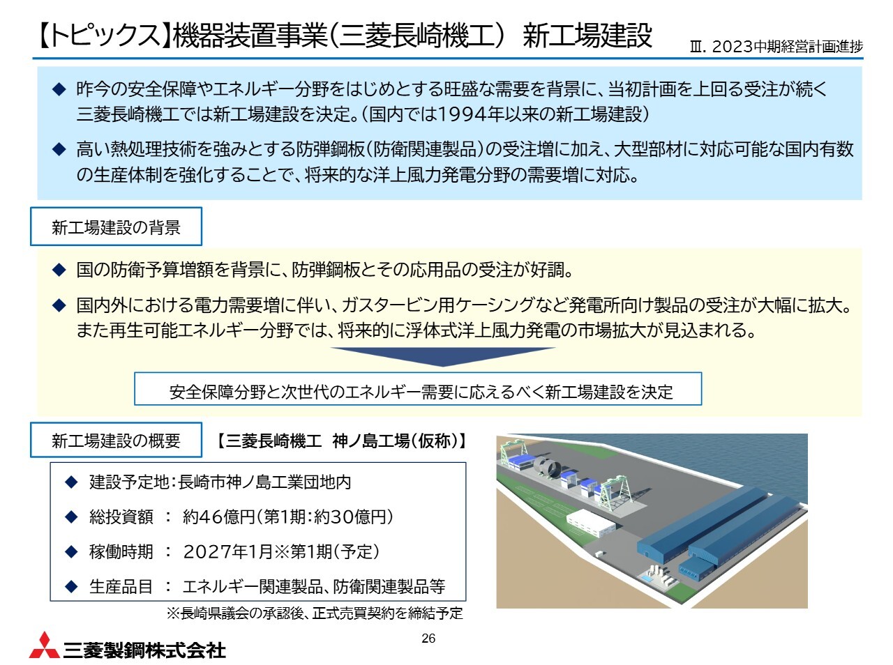 建設地は長崎市神ノ島工業団地で、総投資額は約46億円、第1期は約30億円です。2027年1月稼働予定となっています。エネルギー関連製品や防衛関連製品を主力とし、能力増強と品質基盤の強化を図ります。