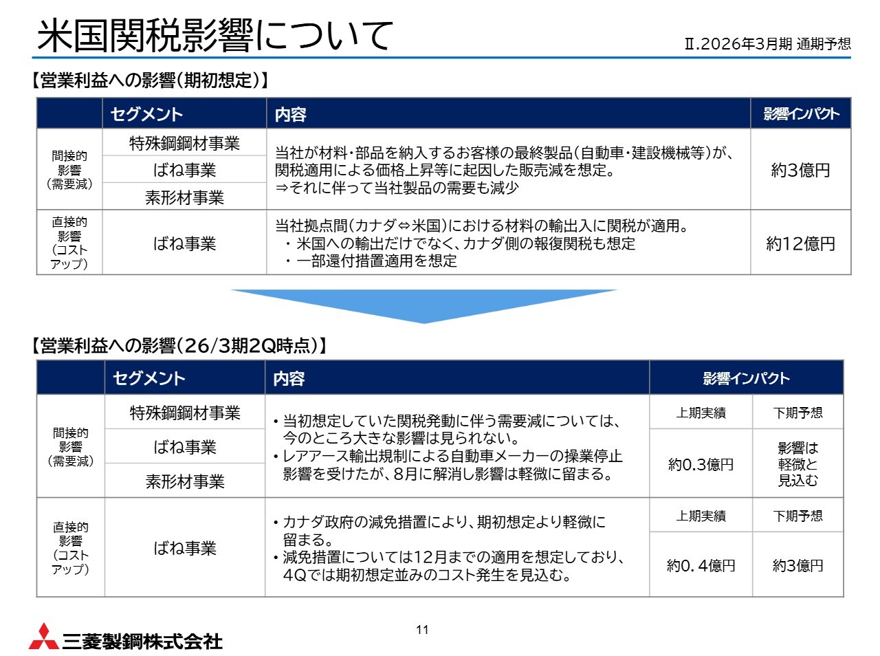 2026年3月期の業績予想についてです。詳細については後ほどご説明しますが、ばね事業は下期も好調を継続し、売上高・営業利益ともに期初予想を上回る見通しです。また、米国関税の影響も期初想定ほど大きくはありませんでした。