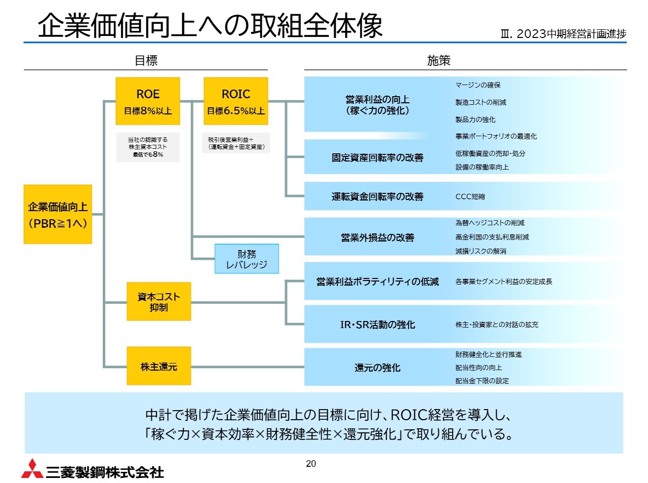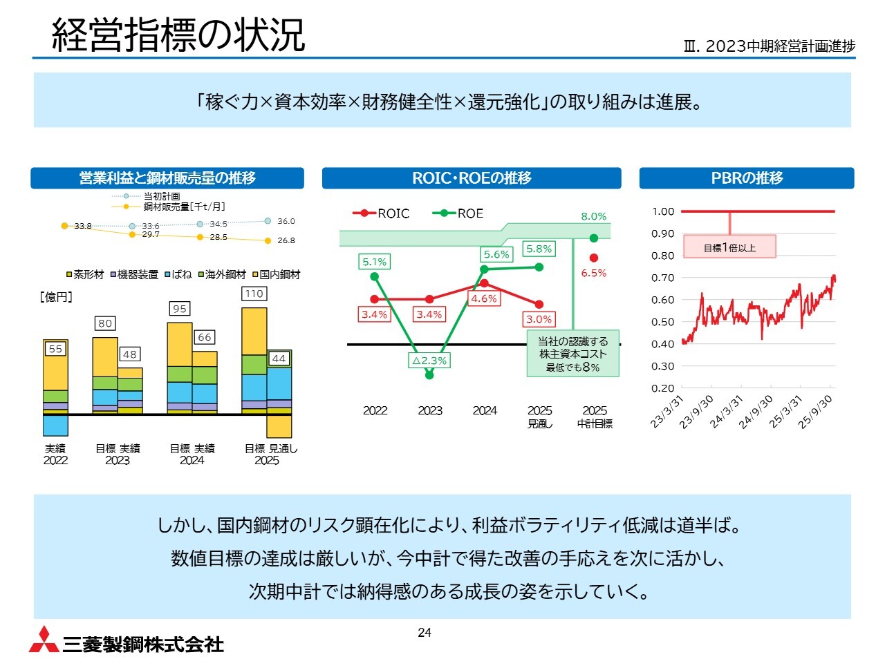 一方で、営業利益、ROE、ROICなどの目標は未達成です。現在、国内鋼材需要の弱含みに加え、供給制約も重なり、収益を圧迫しています。しかしながら、投下資本の軽量化や財務負担の低下により、同じ利益でもROEやROICが改善しやすい構造に近づいています。