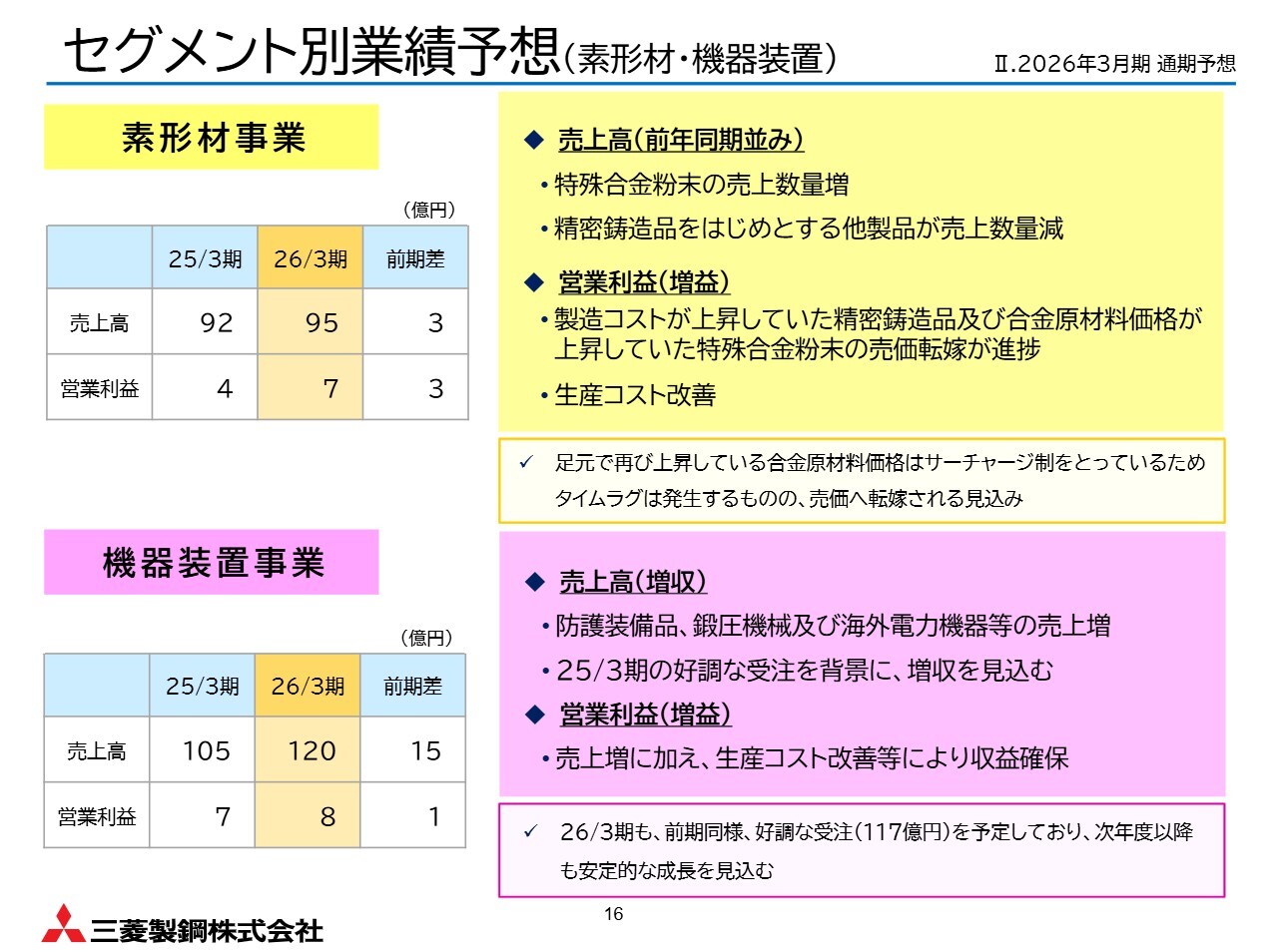 営業利益については、製造コストが上昇していた精密鋳造品や、合金原材料価格が上昇していた特殊合金粉末の売価転嫁が進み、生産コストも改善したことで増益を見込んでいます。