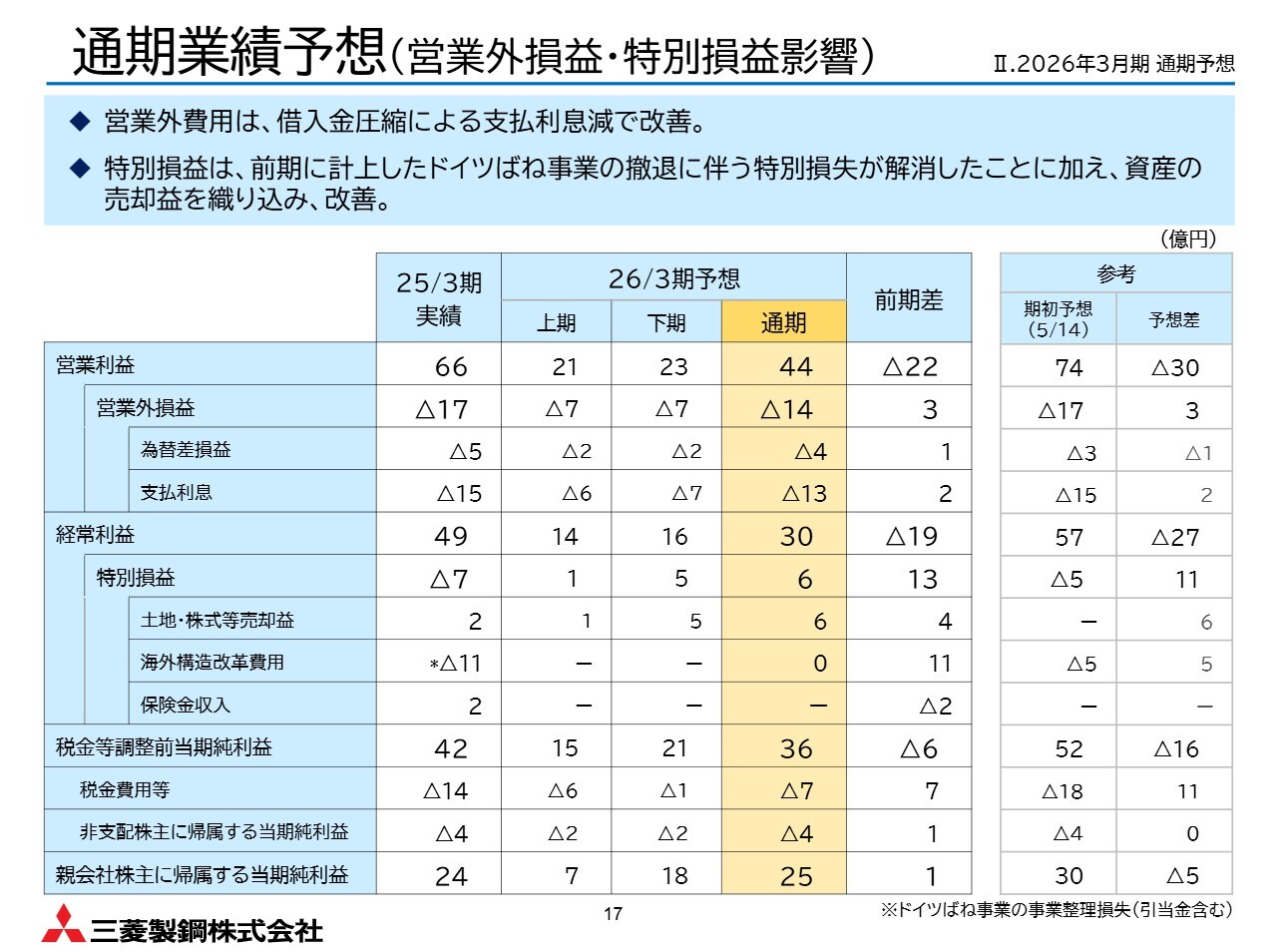 スライドの表2行目の営業外損益については若干の改善が見られます。また、6行目の特別損益については、先ほど触れた資産売却などにより大幅な改善を見込んでいます。
