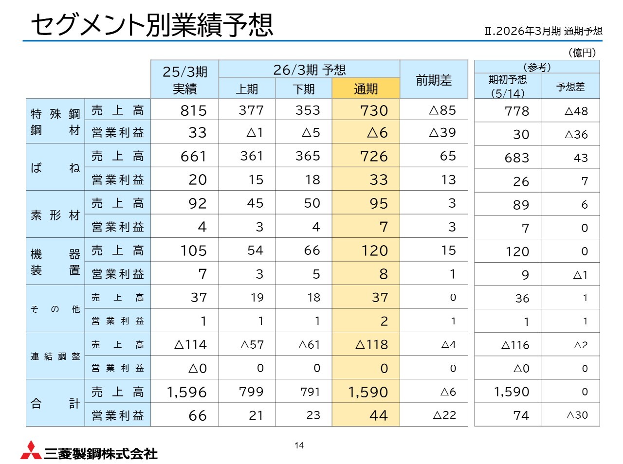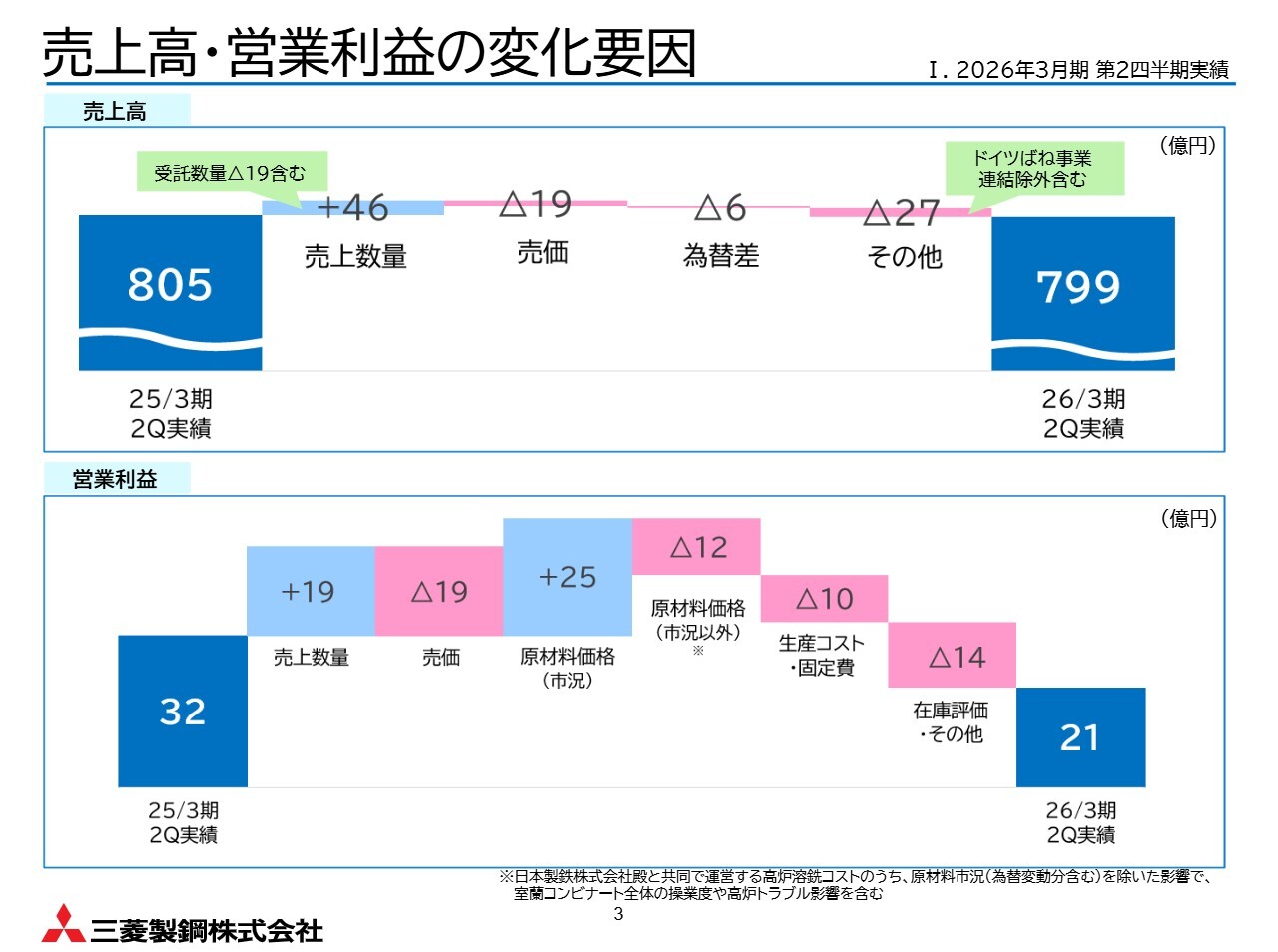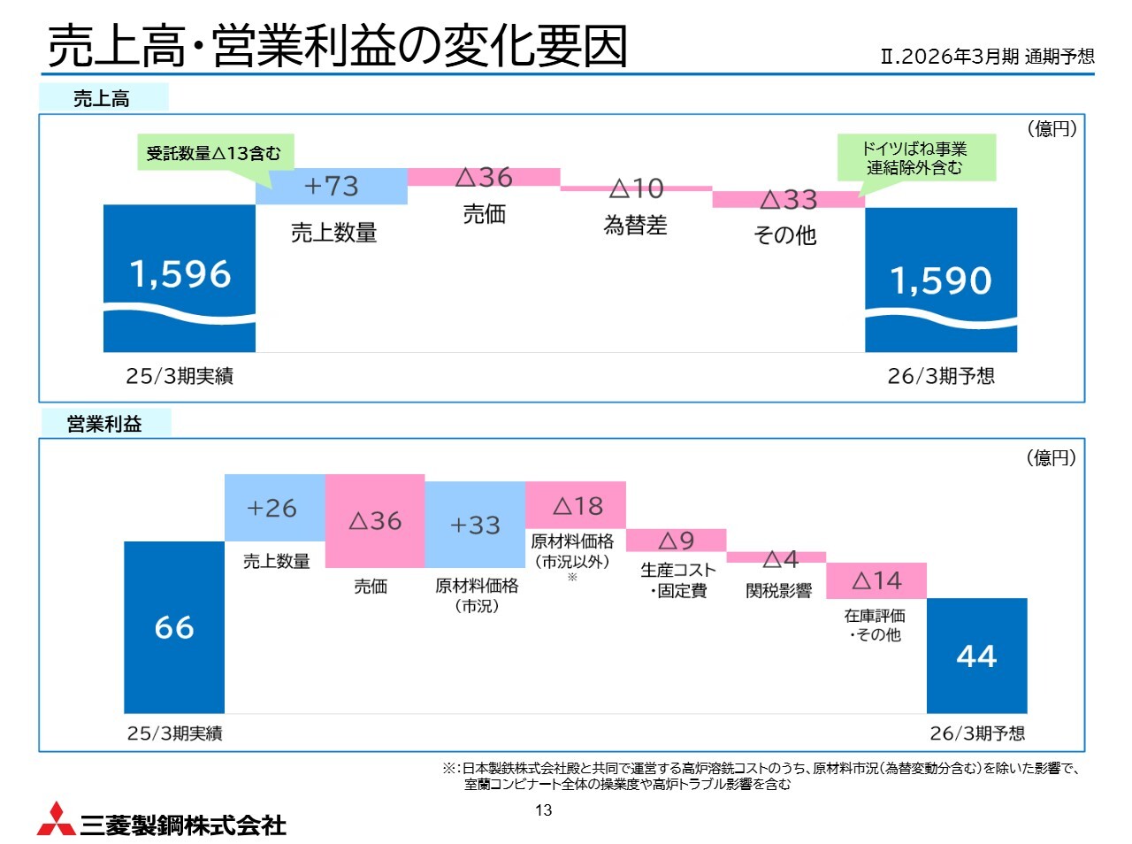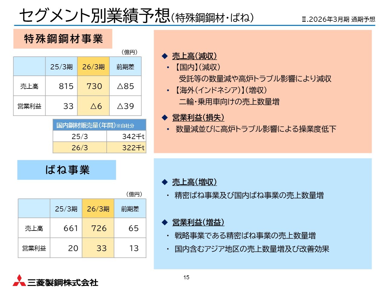 特殊鋼鋼材事業について、受託数量の減少や高炉トラブルの影響による自社販売分の減少を考慮し、減収を見込んでいます。