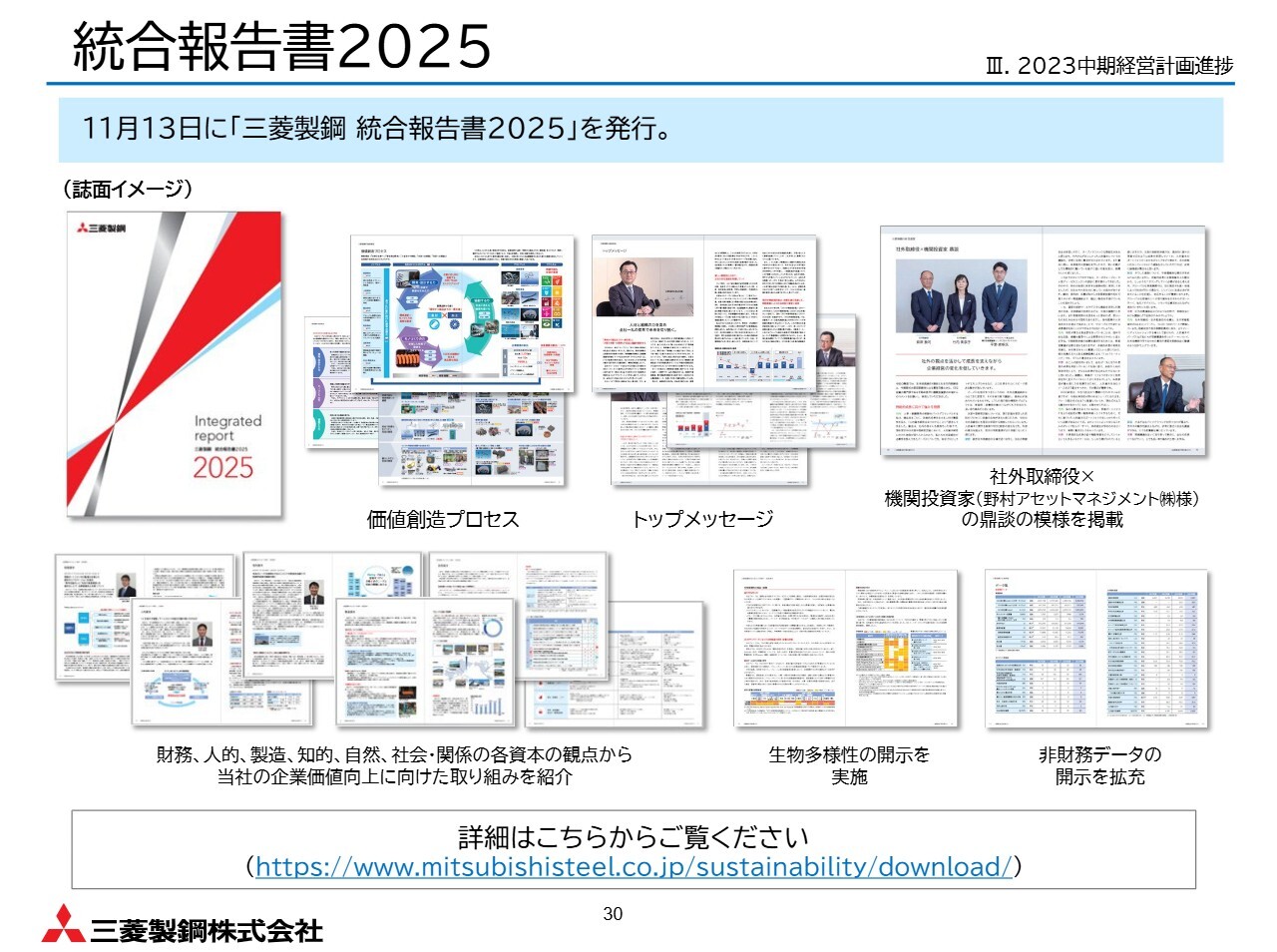 昨日11月13日に、2025年度版の統合報告書を発行しました。内容を拡充し、生物多様性に関する開示や非財務データの拡充に加え、機関投資家の方々と当社社外取締役の座談会の模様などを掲載しています。ぜひご覧ください。