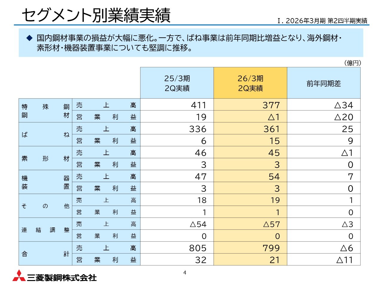 上期においては、ばね、素形材、機器装置および海外鋼材事業がほぼ計画どおりに進捗しています。