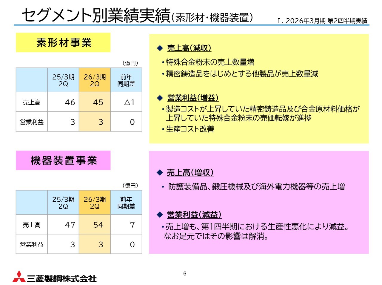 機器装置事業では、防護装備品や鍛圧機械、海外電力機器などの売上が伸び、増収となりましたが、第1四半期の一時的な生産性悪化により、営業利益は前年度並みでした。