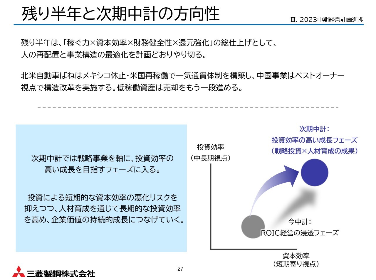 以上の取り組みから、投下資本の圧縮が進み、資本効率が向上しやすい体質への転換が前進しています。多くの事業でROICが改善に向かっており、素形材事業、機器装置事業、ばね事業、海外鋼材事業は、中期経営計画の利益目標を達成する見通しです。