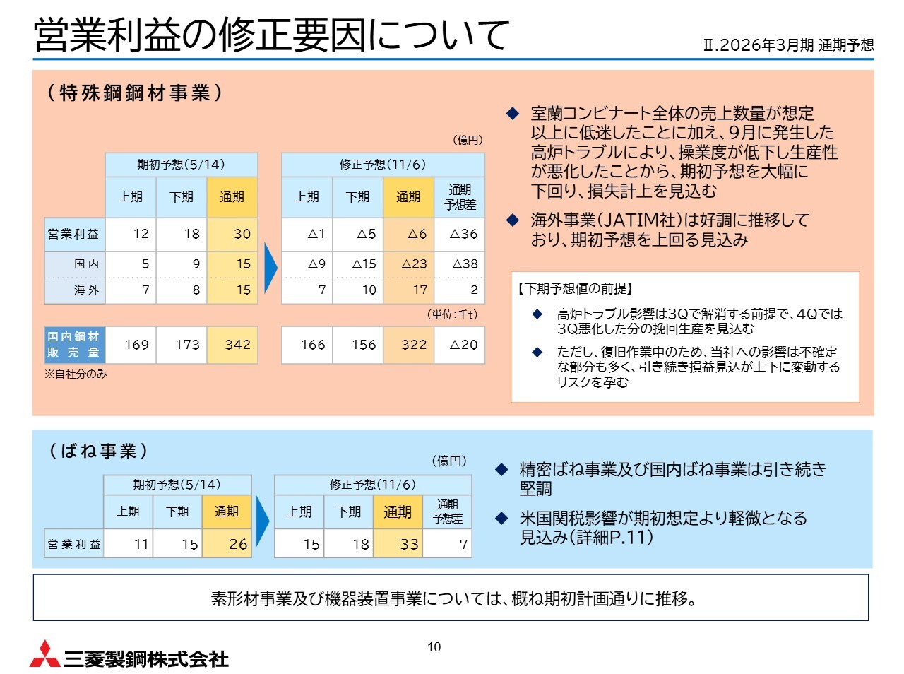 営業利益の主な修正要因についてですが、特殊鋼鋼材事業ではJATIM社が下期も好調を維持し、期初予想を上回る見込みです。しかし、先ほどご説明したとおり、国内鋼材事業の減益の影響が非常に大きくなっています。