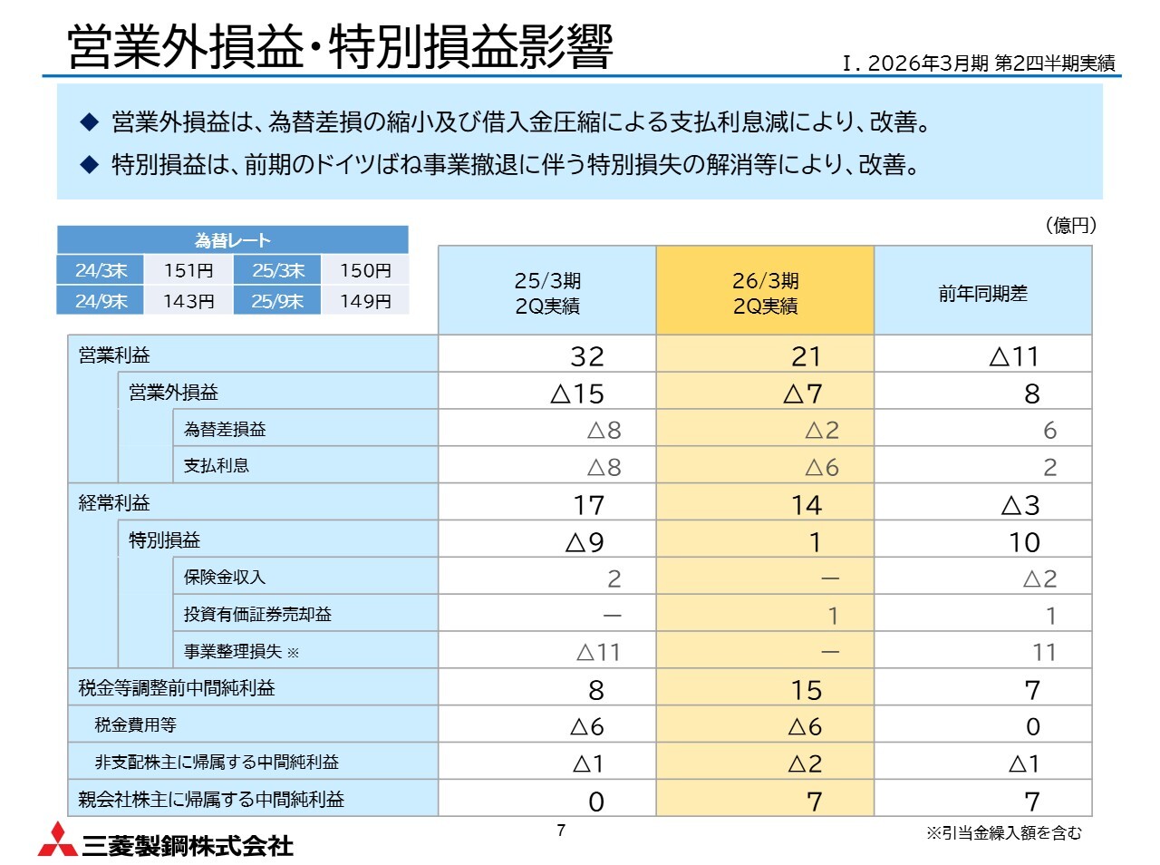 経常利益および中間純利益は、営業外費用の縮小や、昨年計上したドイツのばね事業の特別損失の影響が解消されたことから、前年同期比7億円増と改善しました。
