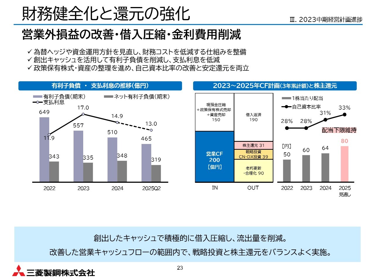 財務健全化と株主還元の強化についてご説明します。為替ヘッジや資金運用方針を見直すことで財務コストを低減し、創出したキャッシュで有利子負債を計画的に圧縮することで、支払利息の低下を実現しました。