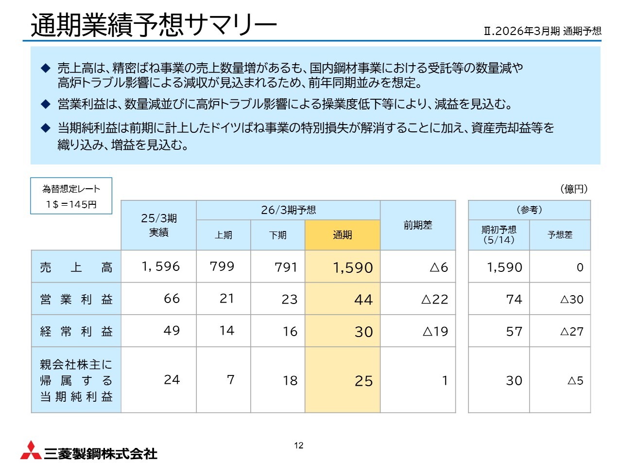 スライドは、通期業績予想をまとめた表です。売上高は、好調な精密ばね事業の売上数量増加が見込まれる一方で、国内鋼材事業の減収の影響により、前年同期並みを想定しています。各利益については、先ほどご説明したとおりです。