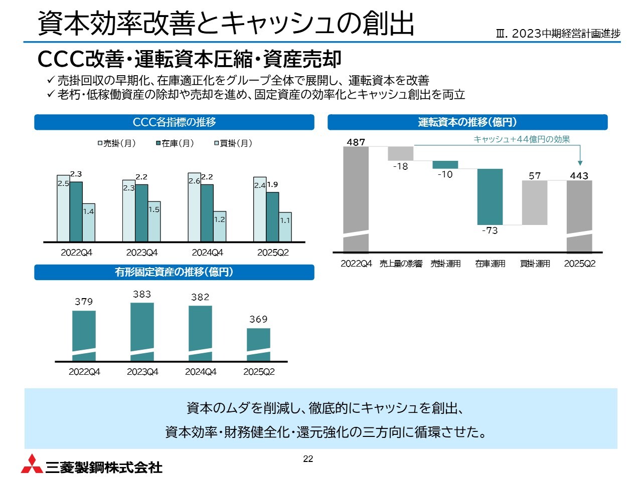資本効率とキャッシュ創出の実績です。全社で売掛金回収の前倒しと在庫の適正化を徹底し、キャッシュ・コンバージョン・サイクル(CCC)を短縮しました。また、老朽・低稼働資産を整理することで、固定資産の軽量化にも取り組みました。