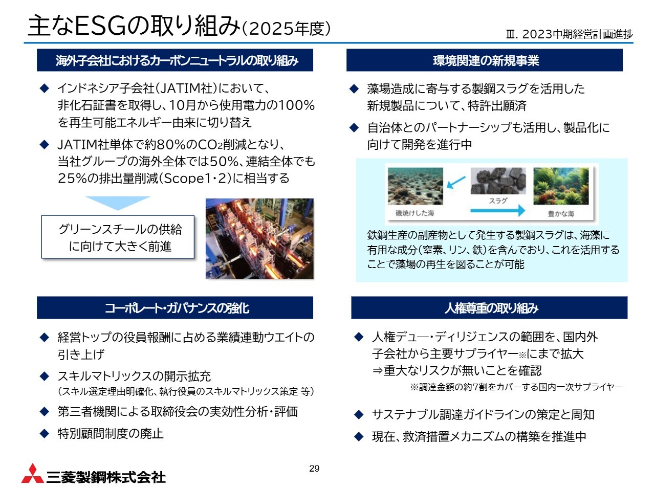 一方で、海外鋼材事業の生産拠点であるインドネシアでは、グリーンスチール供給に向けた第一歩として、非化石証書を取得するなど、成長に向けた取り組みは着実に進めています。