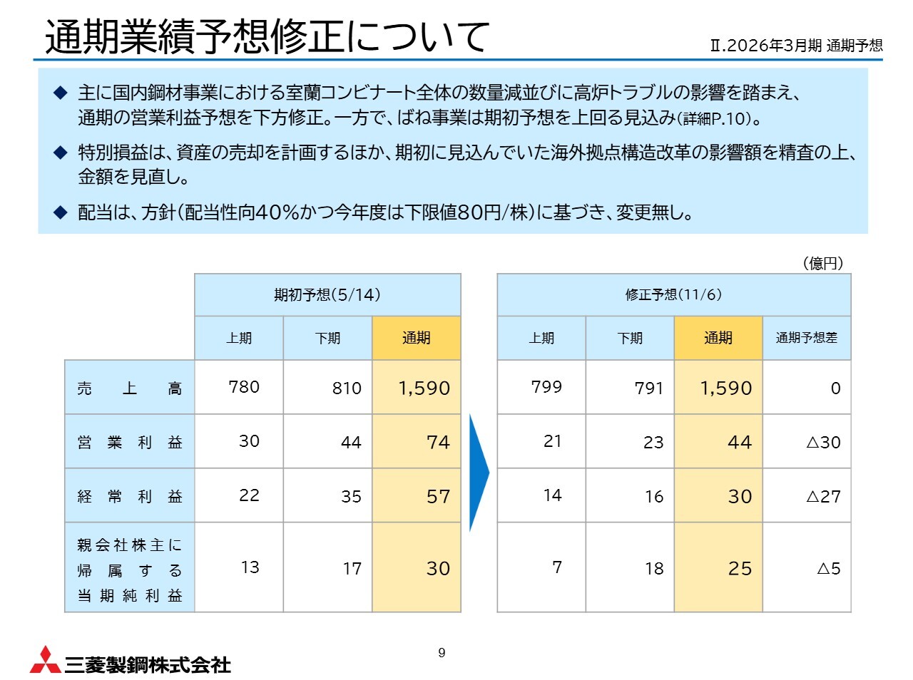 一方で、国内鋼材事業では室蘭コンビナート全体の数量減や高炉トラブルの影響が大きいため、各段階の利益予想を下方修正せざるを得ない状況です。当社が主に手掛ける鉄鋼業や自動車部品産業は、非常に不確実性が高い事業環境に直面していると認識しています。