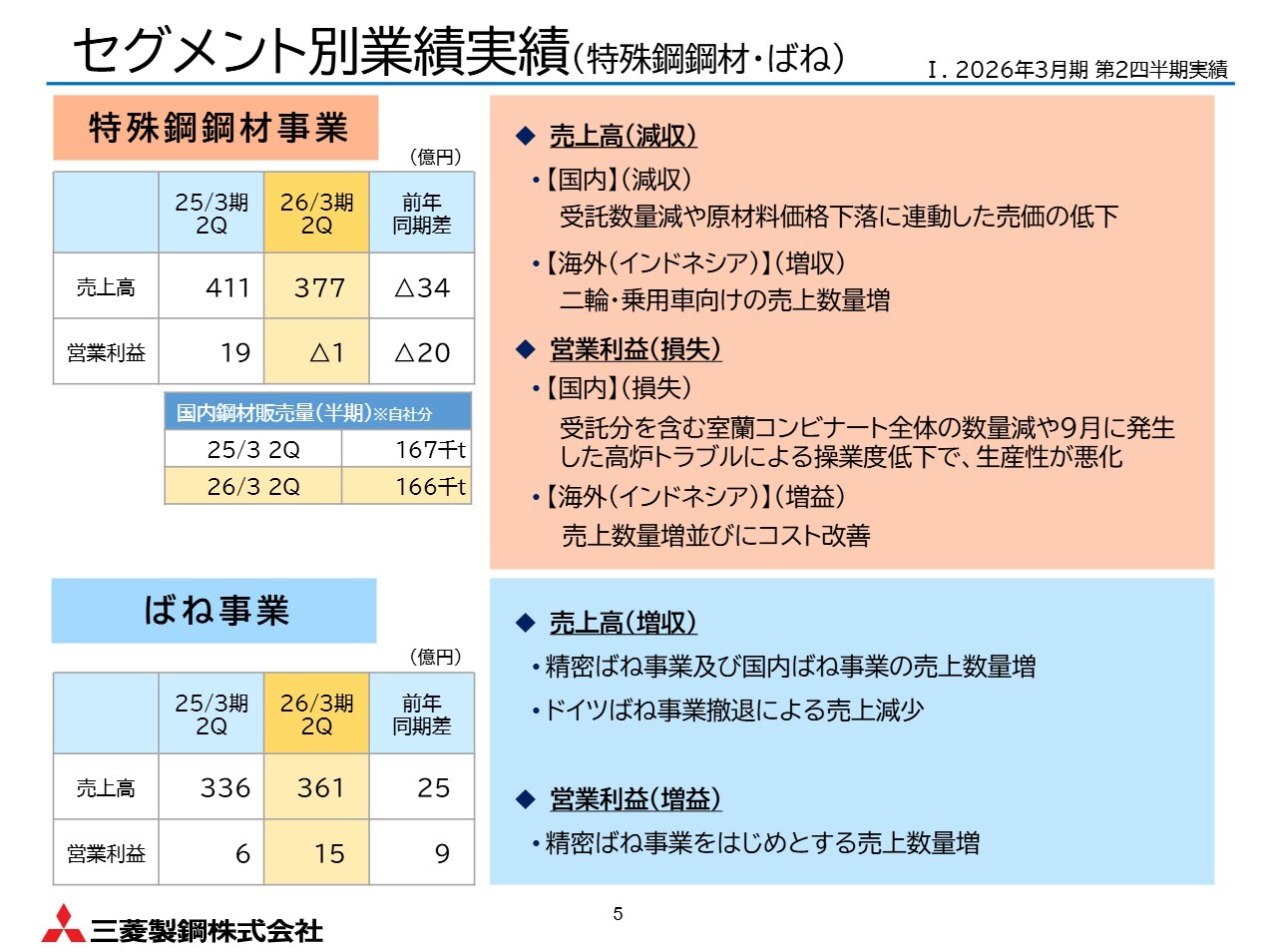 赤羽俊樹氏(以下、赤羽):経理部長の赤羽です。まず売上数量については、主にばね事業が好調で売上数量が増えたことが、増益に寄与しています。一方で、売価については、主に市況の影響、特に鉄鉱石や石炭価格下落に連動して売価が低下した影響が大きいです。期初想定時にはこの市況の予測を織り込むことが難しく、期初に比べて差異が生じています。