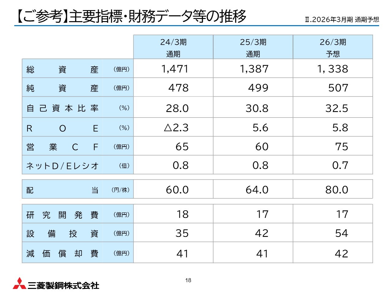 今期は、中期経営計画の最終年度です。国内鋼材需要の低迷やトランプ関税の動向など、厳しく不透明な事業環境によって営業利益の達成は厳しい状況にありますが、ROE8パーセントといった中期経営計画KPIに近づけるよう対応を進めるとともに、「2030年のありたい姿」に向けて取り組んでいきます。