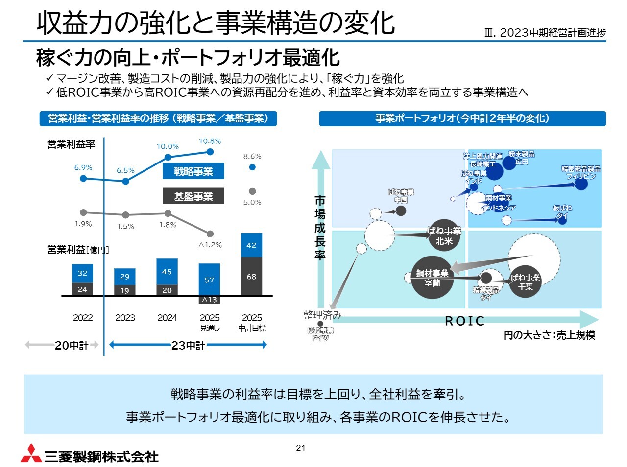稼ぐ力の向上についてです。マージンの改善、製造コストの削減、事業ポートフォリオの最適化を進めました。戦略事業の利益率は目標を上回り、全社の利益を牽引しています。また、基盤事業においてもROICの改善が進んでいます。