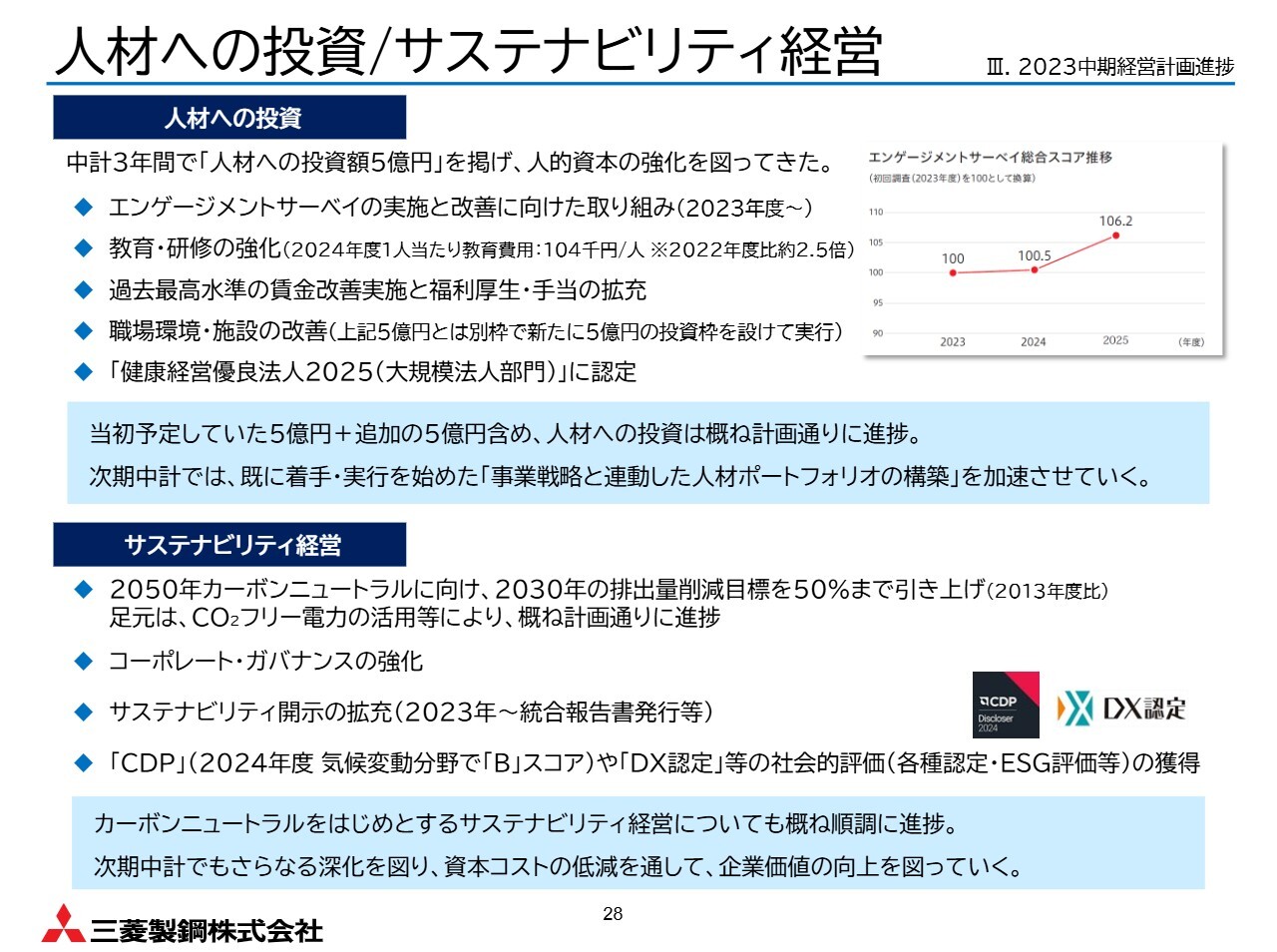 さらに、2023年度よりエンゲージメントサーベイを実施しており、スライドに示しているとおり、スコアは改善傾向にあります。引き続き、当社の成長の源である社員の満足度向上に取り組んでいきます。