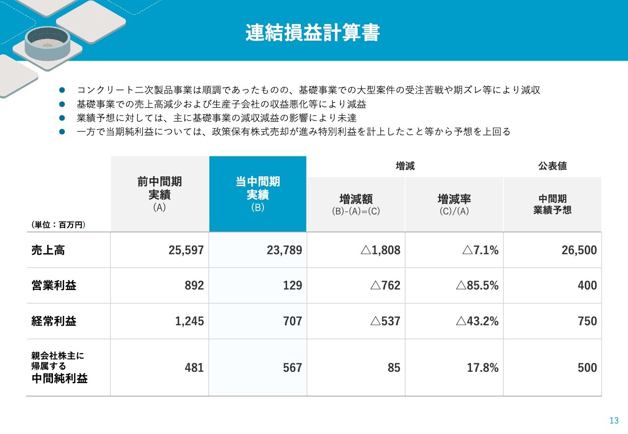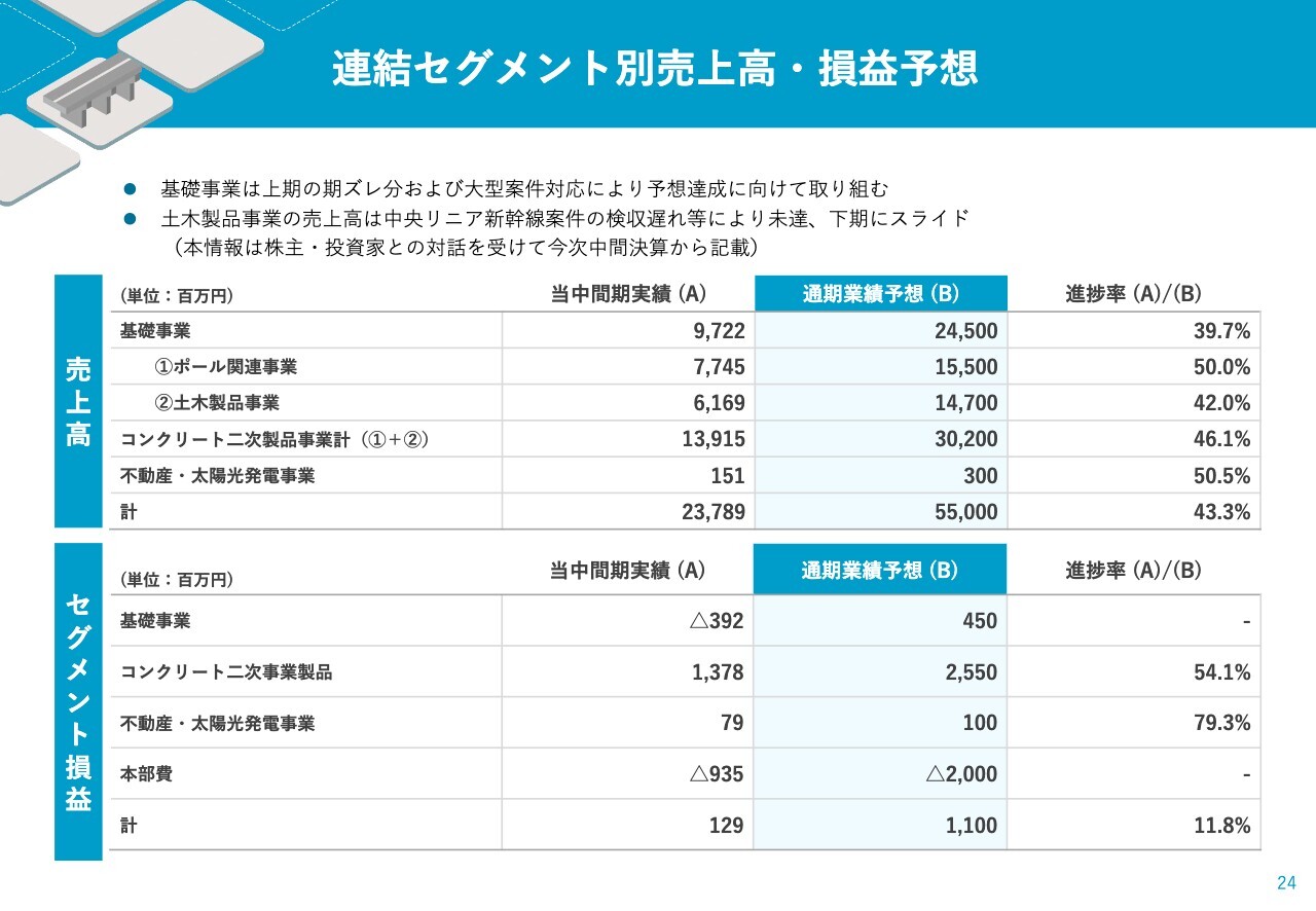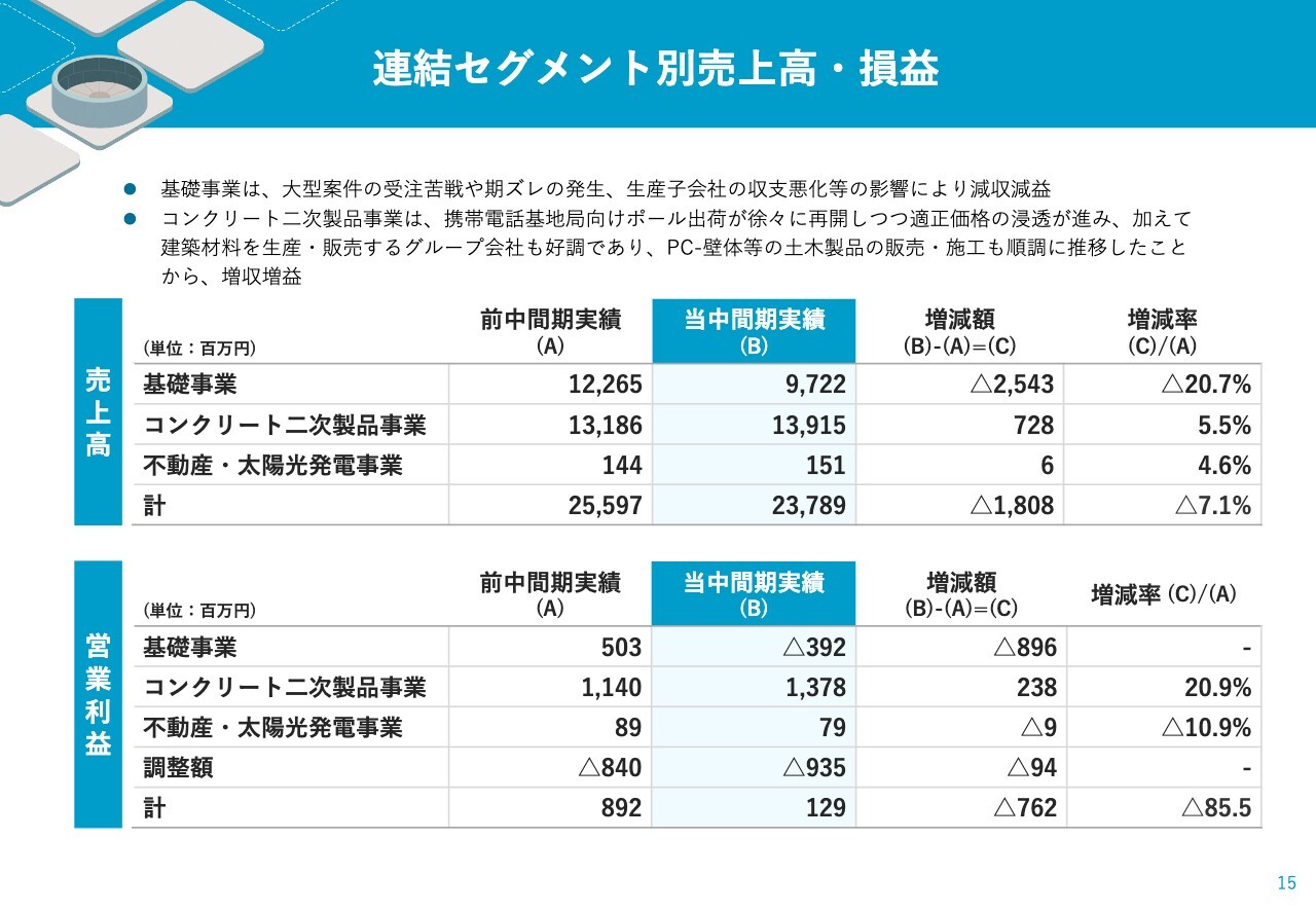コンクリート二次製品事業については順調に推移しました。しかしながら基礎事業において大規模案件の受注に苦戦したことや、期ずれなどによる基礎事業における売上高の減少、および生産子会社の収益悪化などの影響により減益となりました。