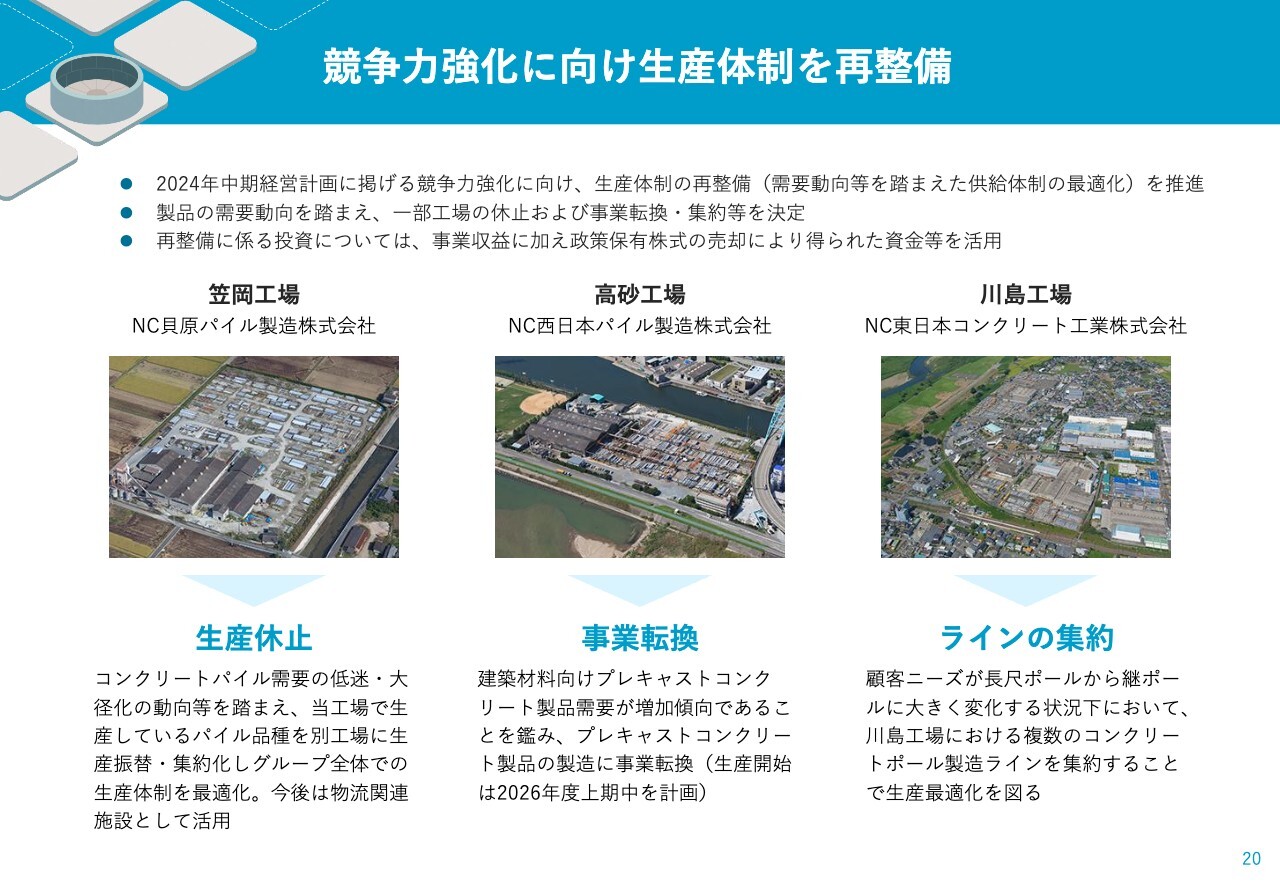 2点目は高砂工場です。兵庫県に位置するこの工場ではポールと小径パイルを生産していましたが、事業転換を計画しました。建築材料向けのプレキャストコンクリート製品の需要が増加傾向にあることを受け、プレキャストコンクリート製品の製造に事業を転換しました。現在工場の整備を進めており、生産開始は2026年度の上期中を計画しています。