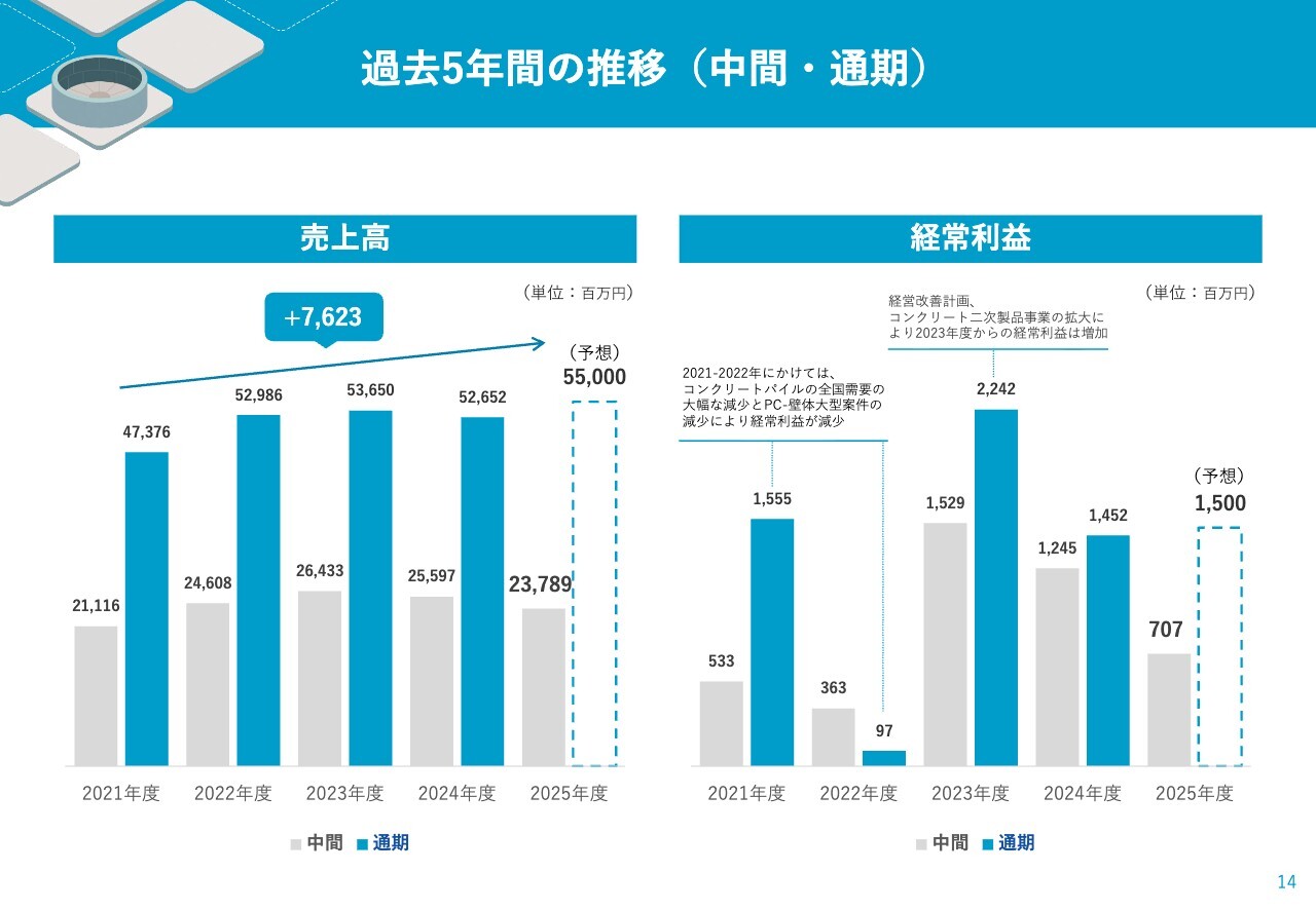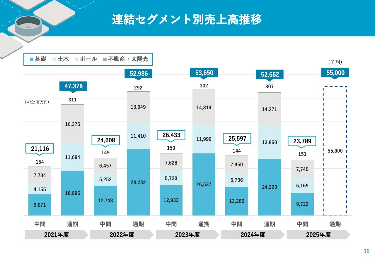 今期中間期について、ポール事業と土木製品事業は前中間期に比べて増収となりました。一方で、基礎事業はここ数年120億円を超える売上が続いていましたが、今年度の中間期は減収となり97億円にとどまりました。