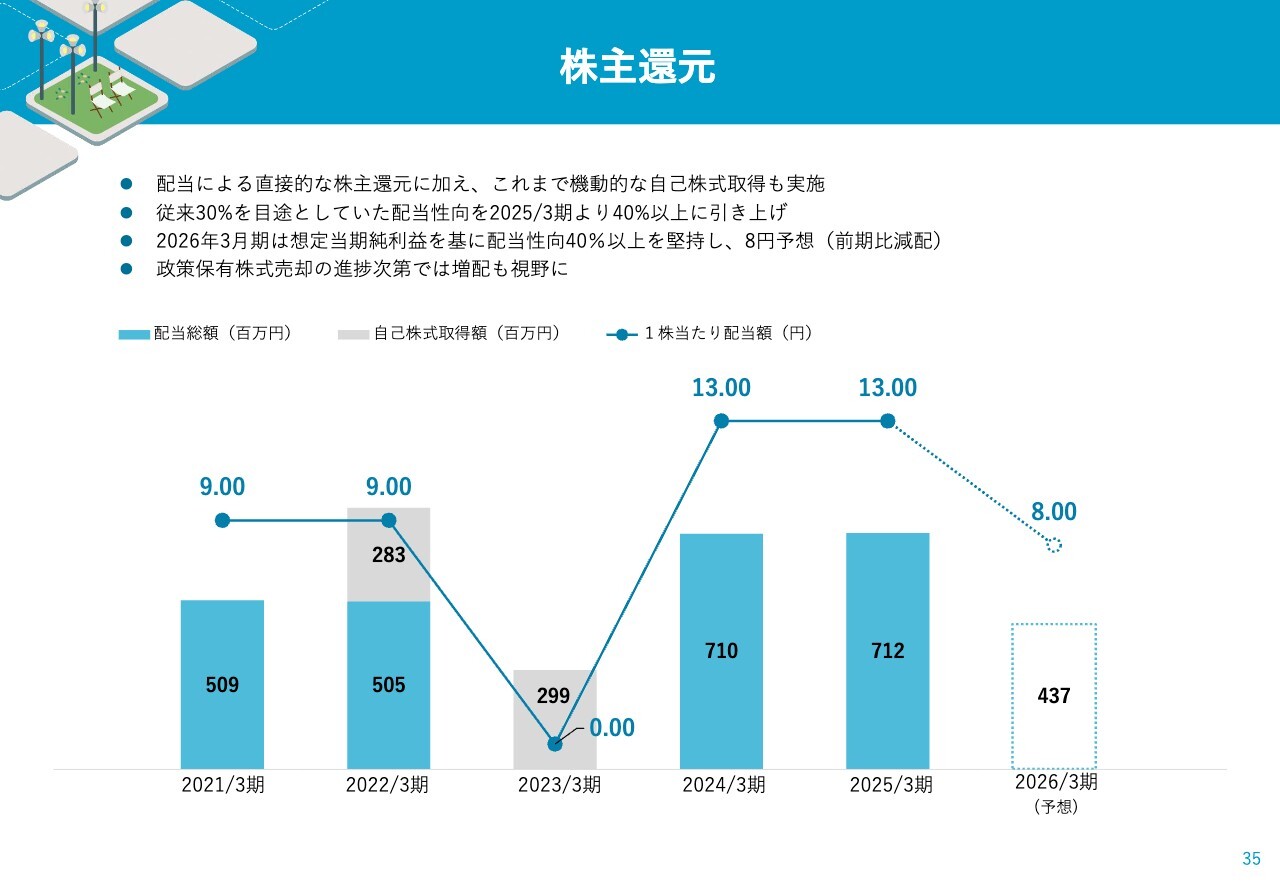 従来、配当性向30パーセントを目途としていましたが、2025年3月期には40パーセント以上に引き上げています。また、2026年3月期については、前期と比較すると減配となるものの、想定当期純利益をもとに配当性向40パーセント以上を確保し、配当額は8円と予想しています。