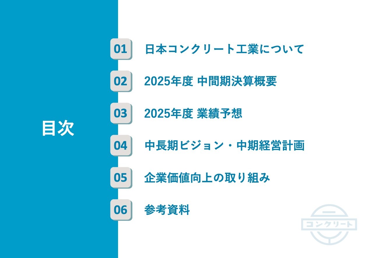 本日は、日本コンクリート工業について、2025年度中間期決算概要、2025年度業績予想、中長期ビジョン・中期経営計画、企業価値向上の取り組みの順でご説明します。