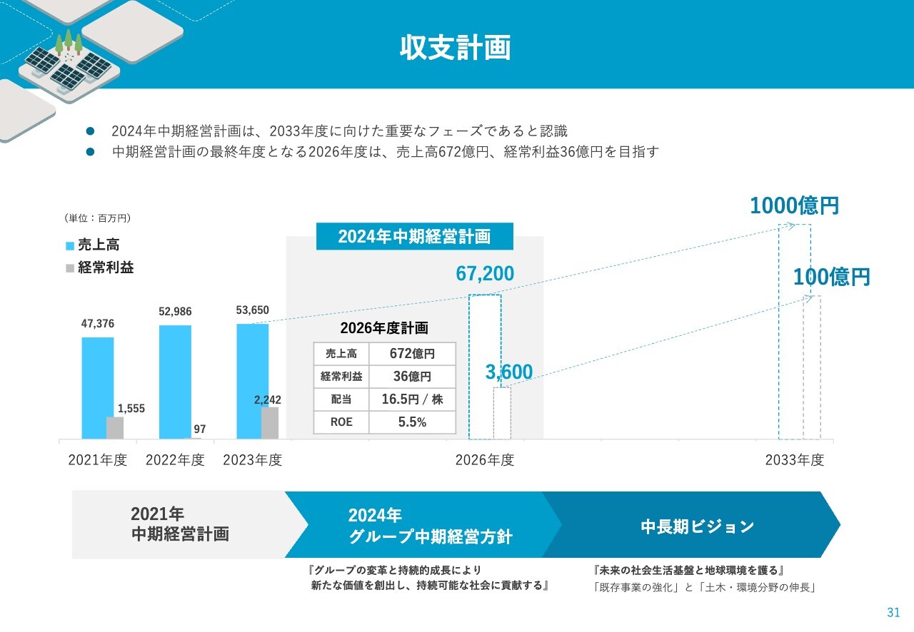 2024年中期経営計画は、10年後の2033年度に向けた重要なフェーズと位置付けています。中期経営計画の最終年度である2026年度においては、売上高672億円、経常利益36億円を目指しています。現在、2024年グループ中期経営方針に基づく施策を進めています。