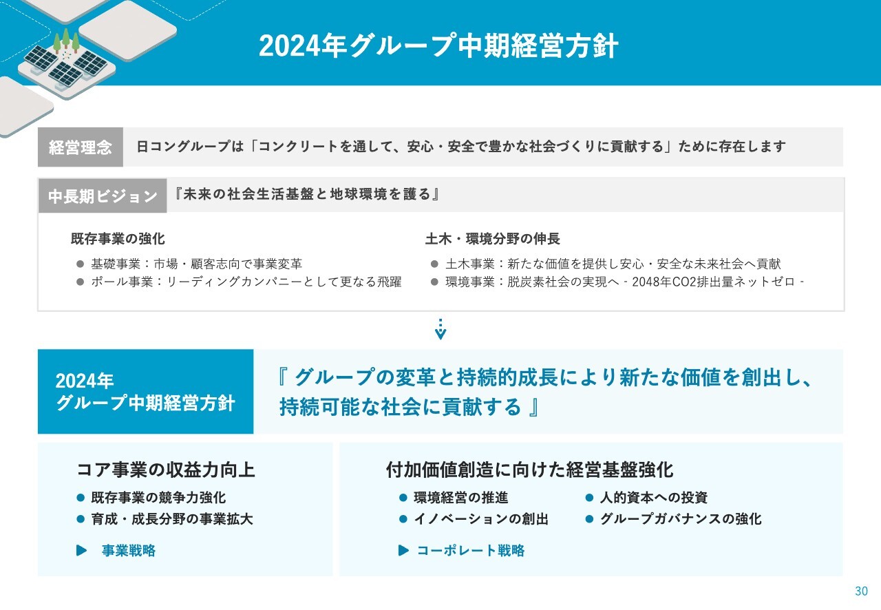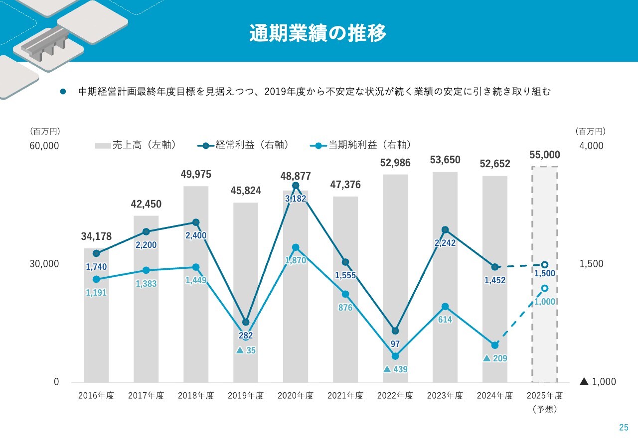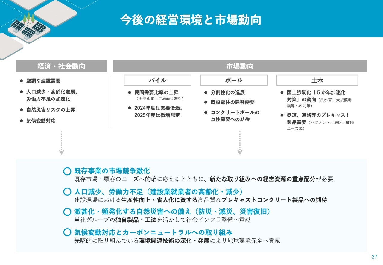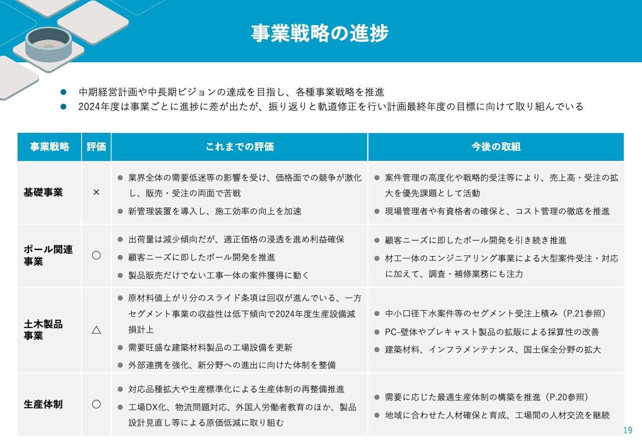 土木製品事業では、原材料の値上がり分に対するスライド条項の回収が進んでいます。しかしながらセグメント事業の収益性は低く、2024年度には生産設備の減損を計上しています。その一方で、需要が高い建築材料製品については工場の設備更新が進められています。また外部連携の強化や新分野への進出に向けた体制を整備しています。
