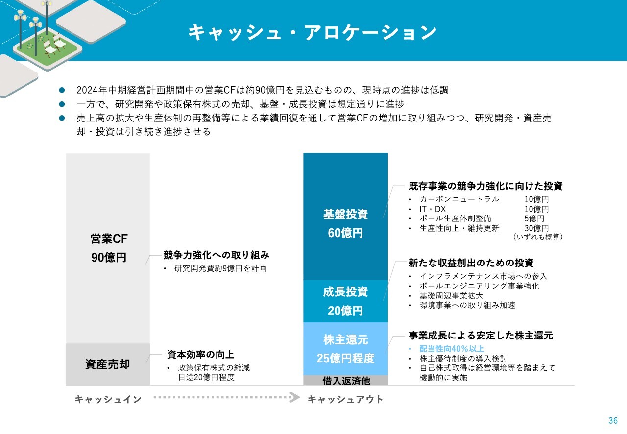 キャッシュ・アロケーションについては、2024年中期経営計画期間中に営業キャッシュフロー約90億円と見込んでいましたが、現時点ではその進捗は低調です。一方で、研究開発や政策保有株式の売却、基盤・成長投資は想定どおりに進捗しています。