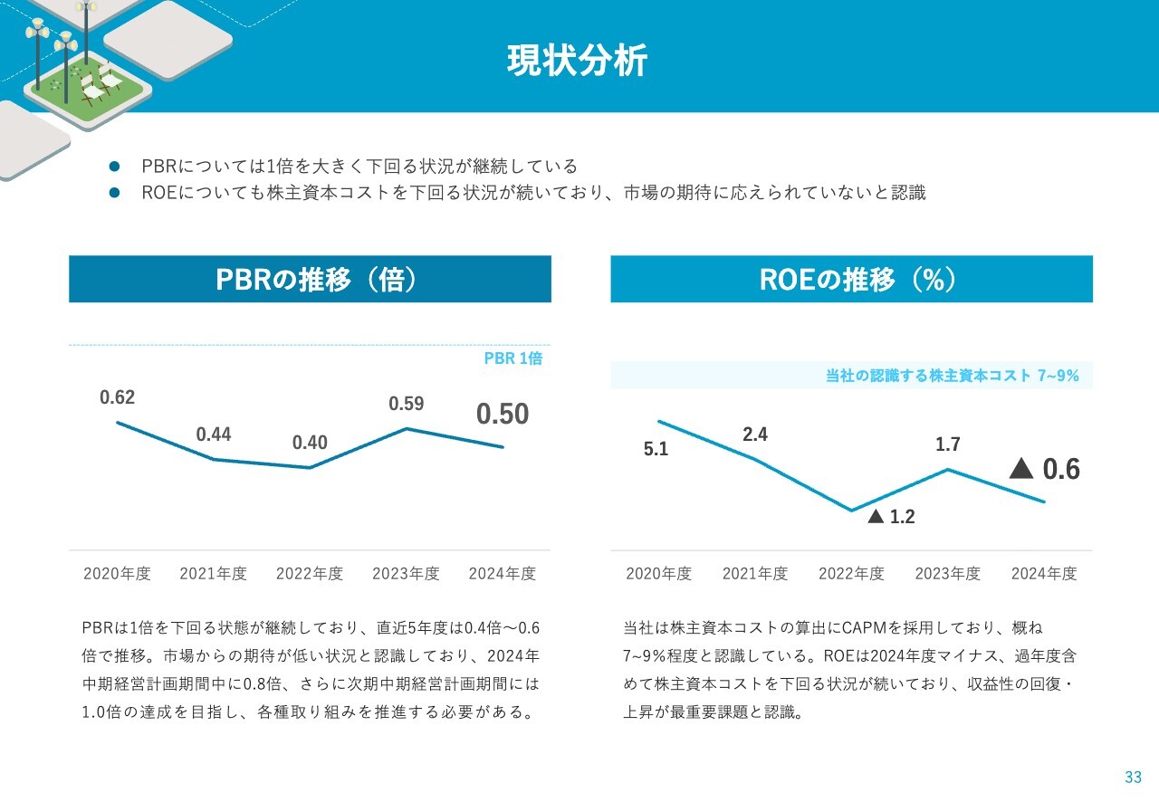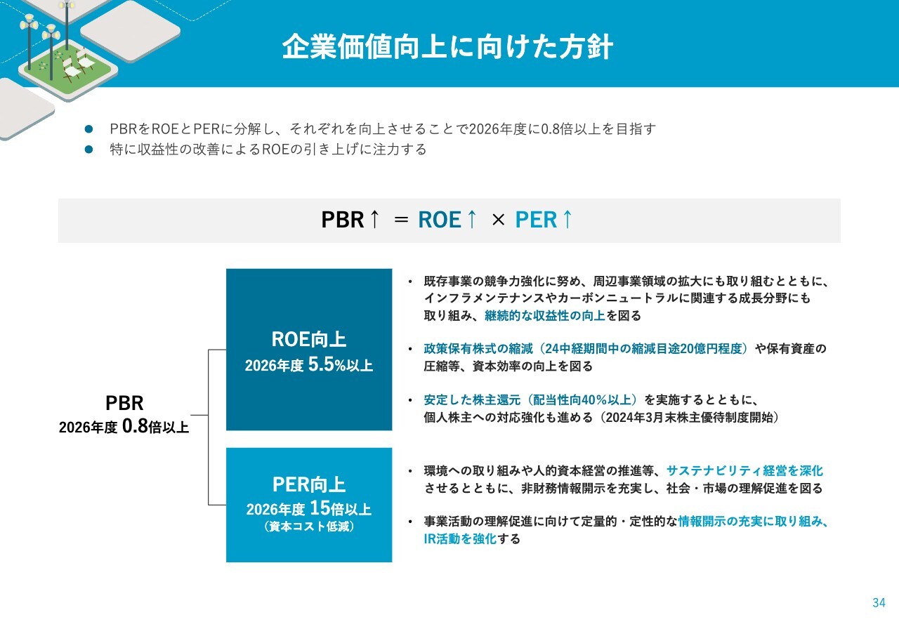 それらを向上させるために、PBRをROEとPERに分解し、それぞれを向上させることで、2026年度には0.8倍以上を目指す方向で考えています。特にROEの引き上げには、収益性の向上および改善が重要であると認識しており、それらを目標に注力していく所存です。