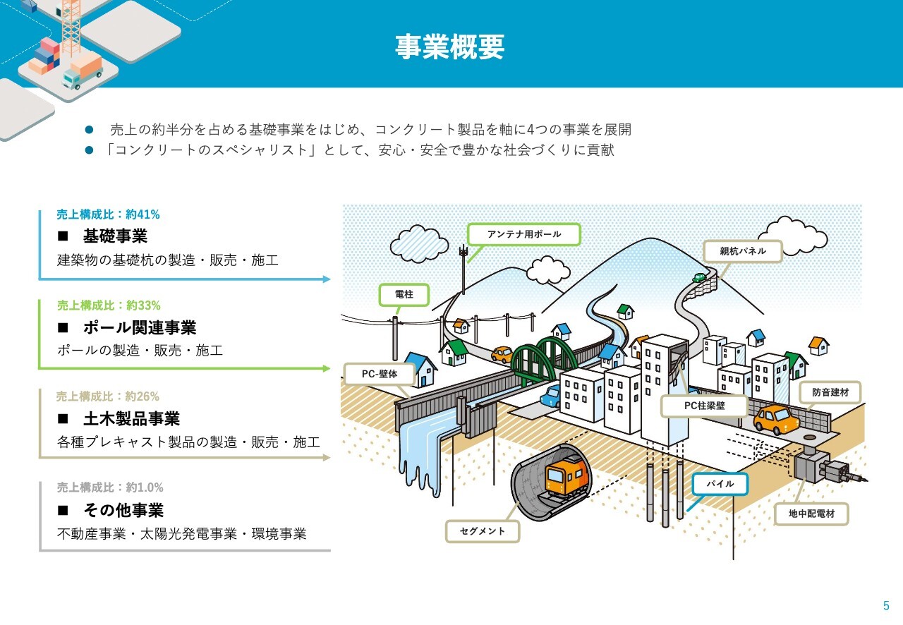 事業概要です。当社はコンクリート製品を基軸に4つの事業を展開しています。「コンクリートのスペシャリスト」として安心・安全で豊かな社会づくりに貢献するため、日々努力を重ねています。