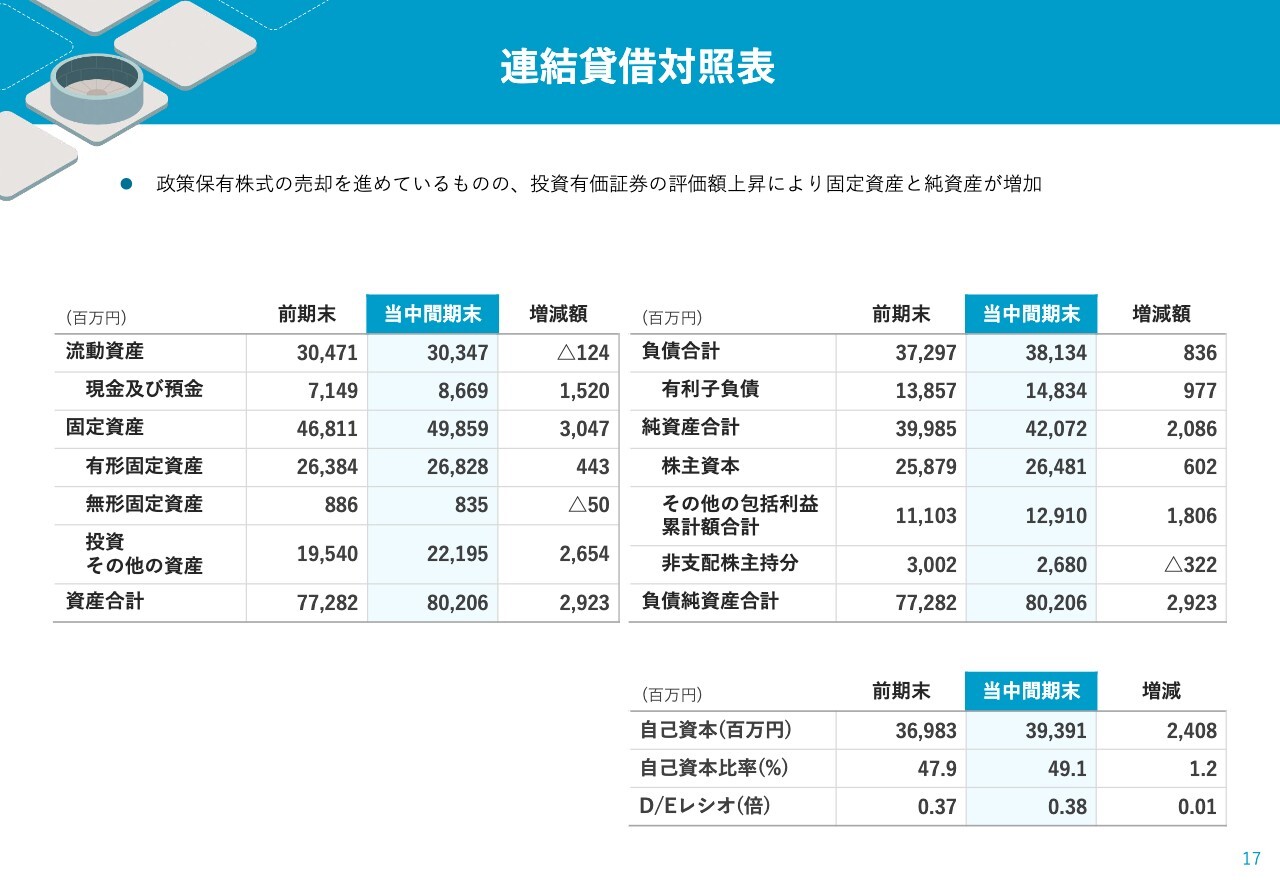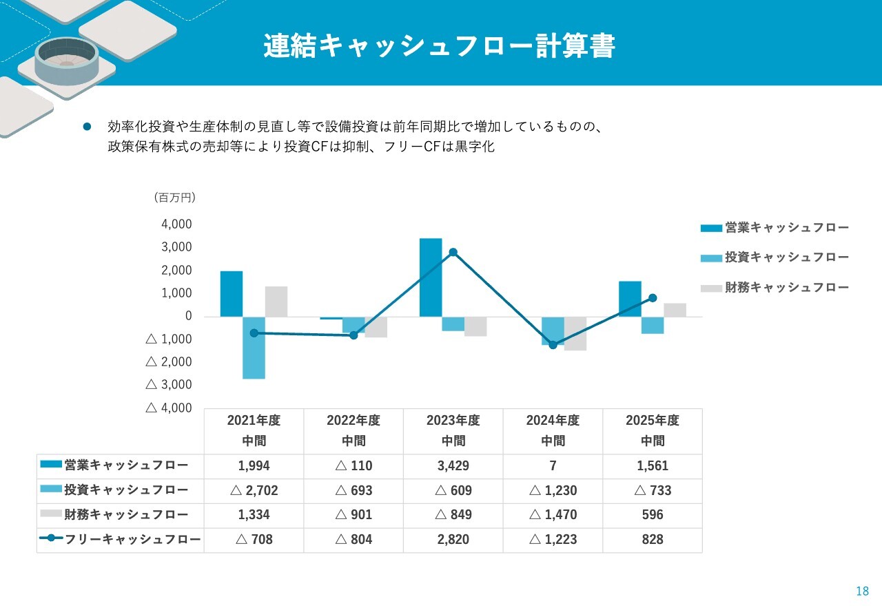 効率化への投資や生産体制の見直しなどにより、設備投資は前年同期比で増加していますが、政策保有株式の売却などにより投資キャッシュフローは抑制されています。その結果、フリーキャッシュフローは黒字に転換しました。